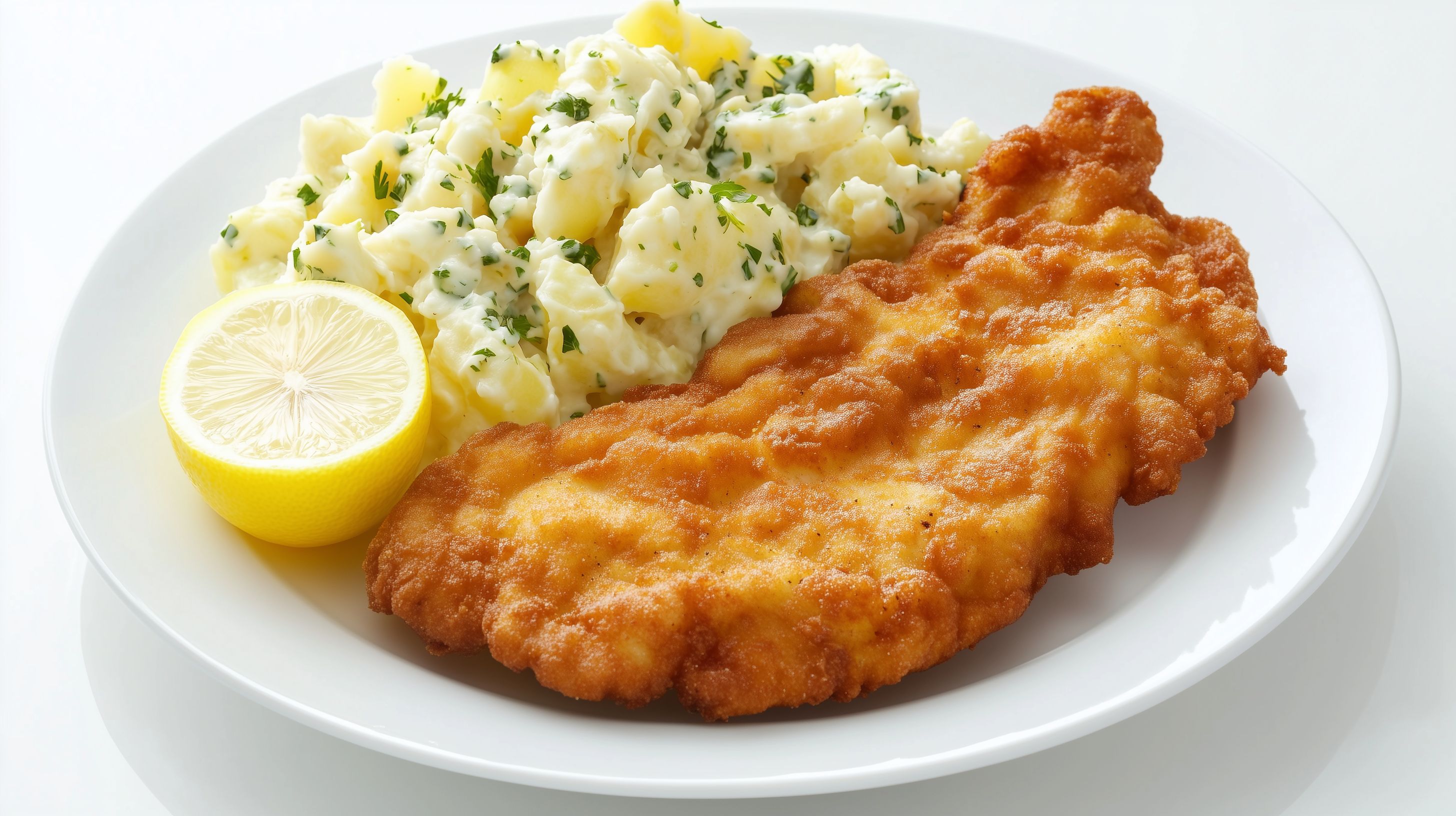 Das Bild zeigt ein leckeres Wiener Schnitzel, serviert mit einer Portion Kartoffelsalat und einer Zitronenscheibe. Das goldgelb panierte Schnitzel ist knusprig und saftig, der Kartoffelsalat ist mit Kräutern und Mayonnaise zubereitet. Die Zitrone sorgt für einen erfrischenden Akzent. Dieses klassische deutsche Gericht eignet sich hervorragend als Hauptspeise in einem Blog-Beitrag, einem Newsletter oder für Werbezwecke in sozialen Medien. Dieses hochauflösende, kostenlose Stockfoto mit Creative-Commons-Lizenz kann vielseitig eingesetzt werden.