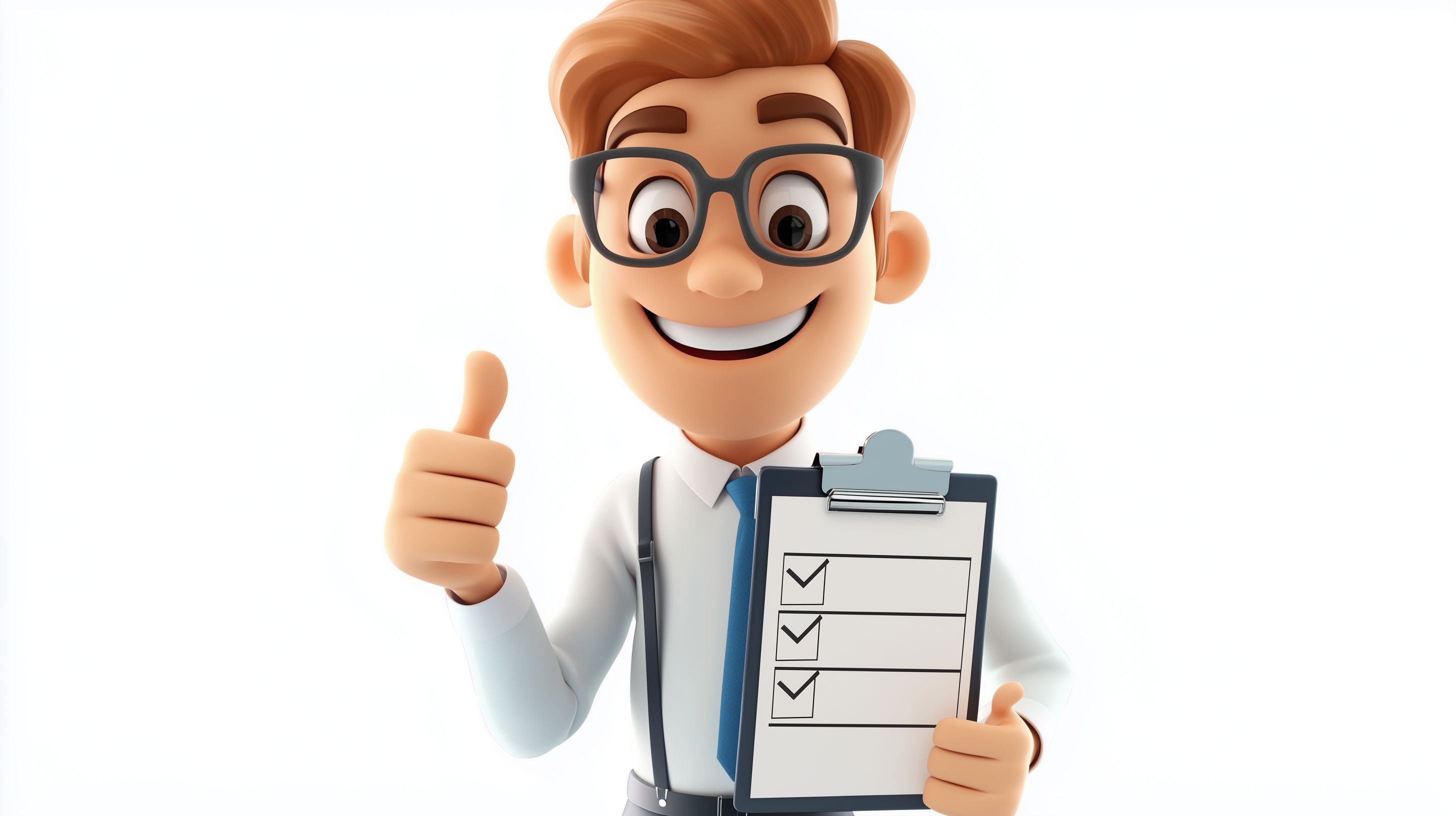 Die 3D-Illustration zeigt einen fröhlichen Geschäftsmann mit Brille, der eine Checkliste in der Hand hält und zufrieden lächelt. Er trägt einen weißen Hemdkragen, eine blaue Krawatte und eine dunkle Jacke. Der Hintergrund ist weiß, was den Fokus auf den Mann mit der Checkliste lenkt. Diese Szene eignet sich gut für die Verwendung in Blogs, Newslettern, Social-Media-Beiträgen oder Werbematerialien zum Thema Produktivität, Effizienz oder Zufriedenheit im Büroalltag. Das hochauflösende Stockfoto ist unter einer kostenlosen Creative-Commons-Lizenz verfügbar.
