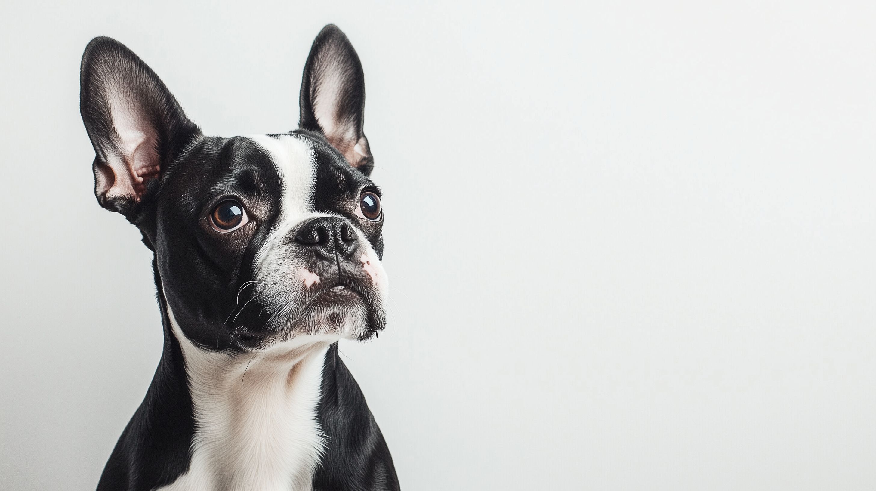 Das Foto zeigt einen Boston Terrier, der mit aufmerksamen Augen und gespitzten Ohren in die Kamera blickt. Der Hund ist schwarz-weiß gefärbt und hebt sich vor dem einfarbigen weißen Hintergrund deutlich ab. Das Bild vermittelt den Eindruck einer freundlichen, wachsamen und intelligenten Persönlichkeit des Vierbeiners. Dieses hochauflösende Stockfoto eignet sich hervorragend für Blogs, Newsletter, Social-Media-Posts oder Werbematerialien, in denen ein aufmerksamer, niedlicher Hund dargestellt werden soll. Es ist unter einer Creative-Commons-Lizenz frei verwendbar.