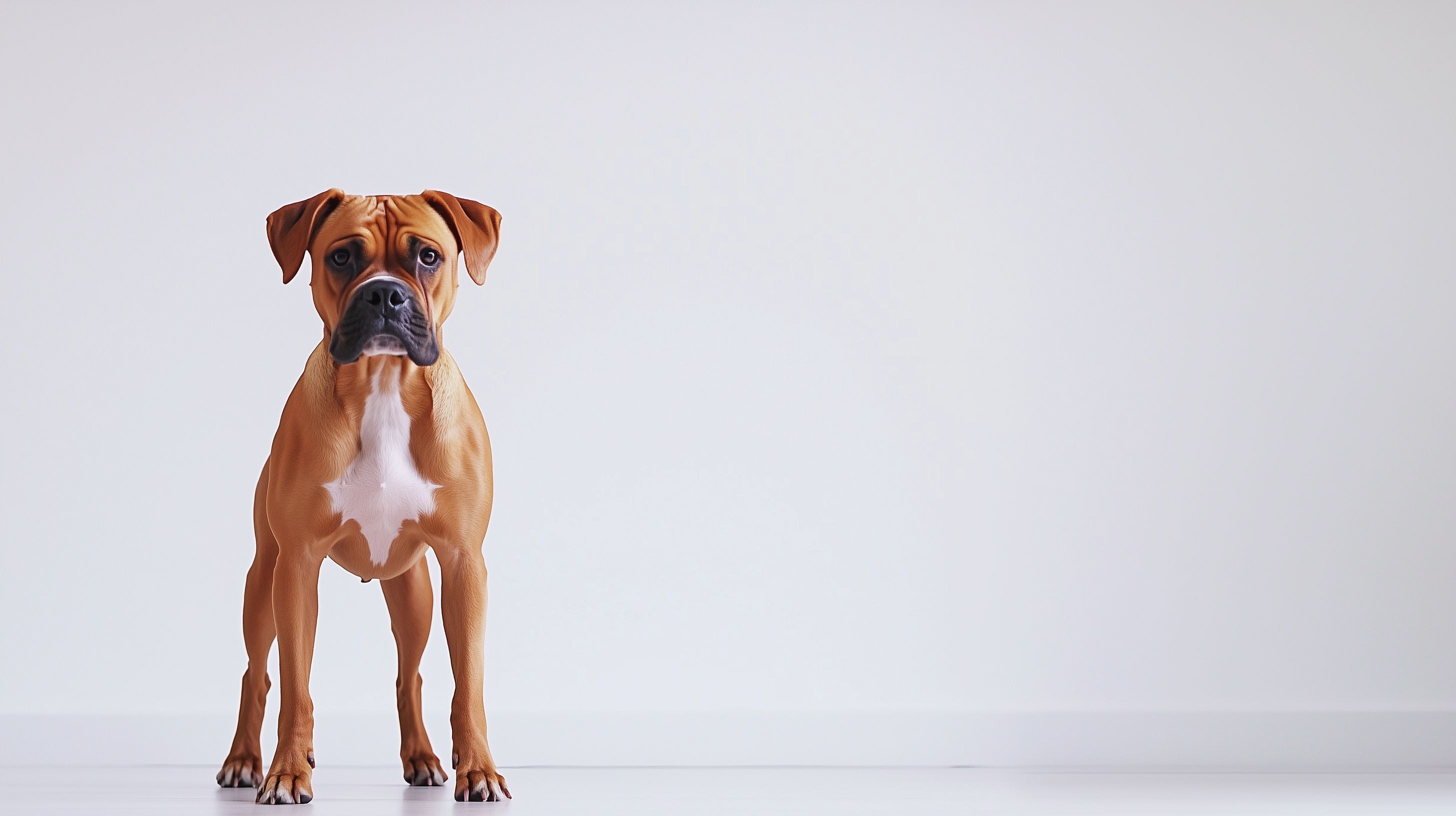 Das Bild zeigt einen aufmerksamen Boxerhund, der vor einem weißen Hintergrund steht. Der Hund blickt direkt in die Kamera, mit einem konzentrierten Ausdruck in seinen braunen Augen. Seine gedrungene, muskulöse Statur und das kurze, glatte Fell in den Farben Braun und Weiß sind charakteristisch für diese Hunderasse.