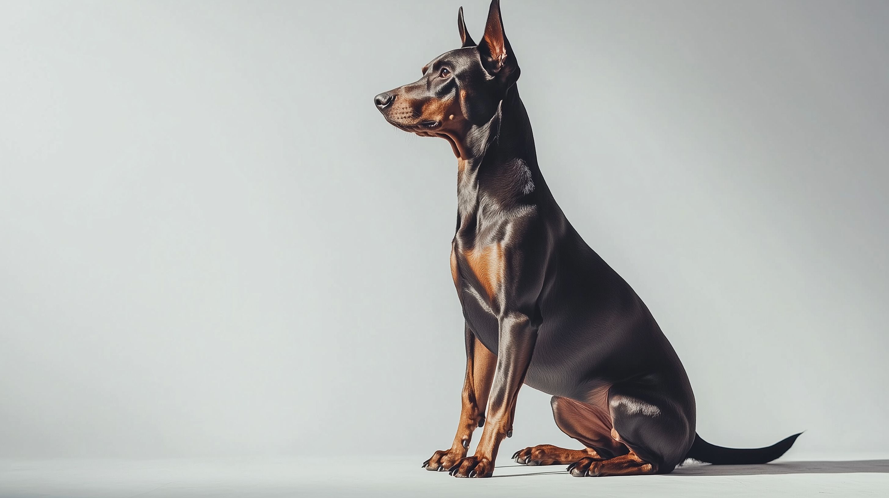 Das Bild zeigt einen aufmerksamen und stolzen Dobermann-Pinscher, der in einer strengen Pose vor einem neutralen Grauton-Hintergrund fotografiert wurde. Das kräftige Schwarz des Hundes kontrastiert eindrucksvoll mit dem kühlen, minimalistischen Hintergrund und verleiht dem Motiv eine elegante und kraftvolle Ausstrahlung. Dieses hochwertige Studiofoto eignet sich hervorragend als Stockfoto für verschiedenste Anwendungen wie Blogbeiträge, Social-Media-Posts, Werbematerial oder Printprodukte. Die Datei ist in hoher Auflösung und unter einer Creative-Commons-Lizenz frei verfügbar.