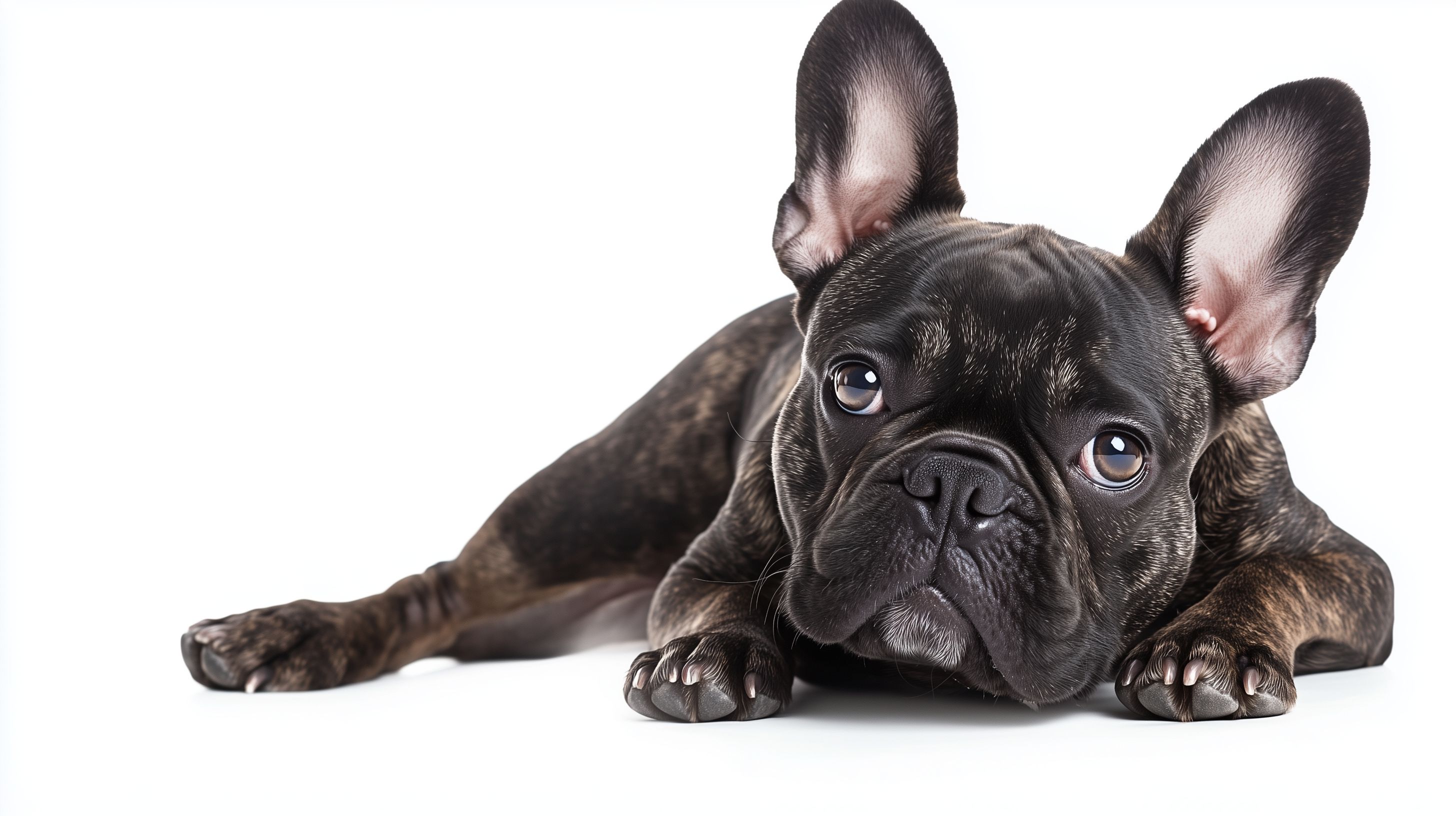 Dieses Stockfoto zeigt eine süße französische Bulldogge, die traurig und nachdenklich auf den Betrachter schaut. Die Kamera hat den Hund im Nahaufnahme-Porträt-Stil fotografiert, so dass sein runder Kopf und seine dunklen Knopfaugen im Mittelpunkt stehen. Der Hund liegt auf einem weißen Hintergrund, der ihn perfekt in Szene setzt. Dieses hochauflösende Foto kann ideal für Blogs, Newsletter, Social-Media-Posts oder Werbung rund um Haustiere, Tiere und Tierfotografie verwendet werden. Das Bild ist unter einer kostenlosen Creative-Commons-Lizenz verfügbar.