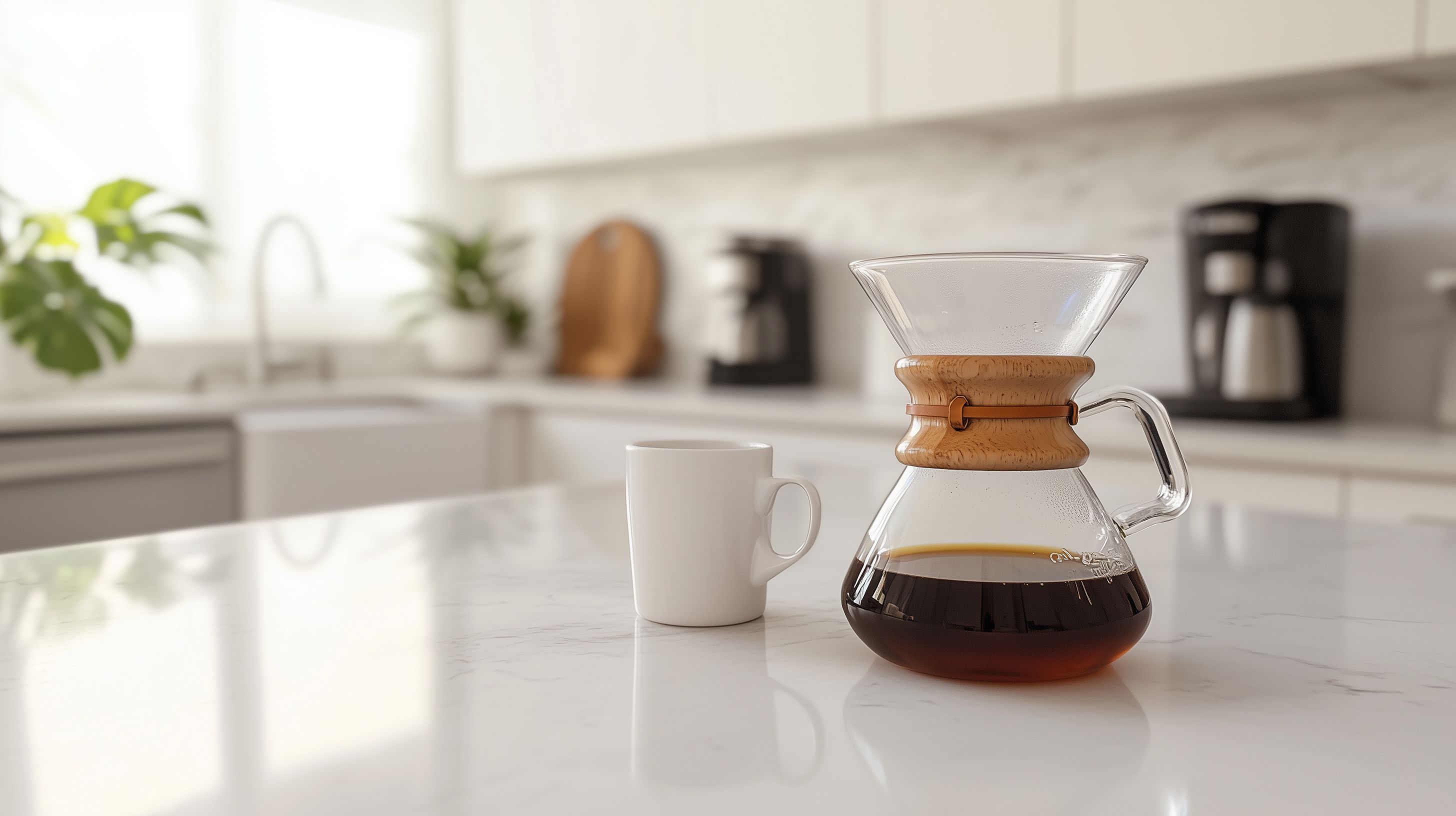 Dieses Foto zeigt einen frisch gebrühten Chemex-Kaffee in einer modernen, hellen Küche. Der Glaskrug mit dem dunklen Getränk steht auf einer weißen Arbeitsplatte, neben einer weißen Tasse. Im Hintergrund sind Elemente der Kücheneinrichtung zu sehen, wie Regale, Geräte und eine Fensterfront, die natürliches Licht hereinlässt. Das Bild vermittelt eine ruhige, entspannte Atmosphäre und lädt dazu ein, den Kaffeegenuss in einem stilvollen, zeitgemäßen Ambiente zu genießen. Das hochwertige Stockfoto eignet sich hervorragend für die Verwendung in Blogs, Werbekampagnen, Social-Media-Posts oder Newslettern rund um Kaffee, Gastronomie und Lifestyle-Themen.