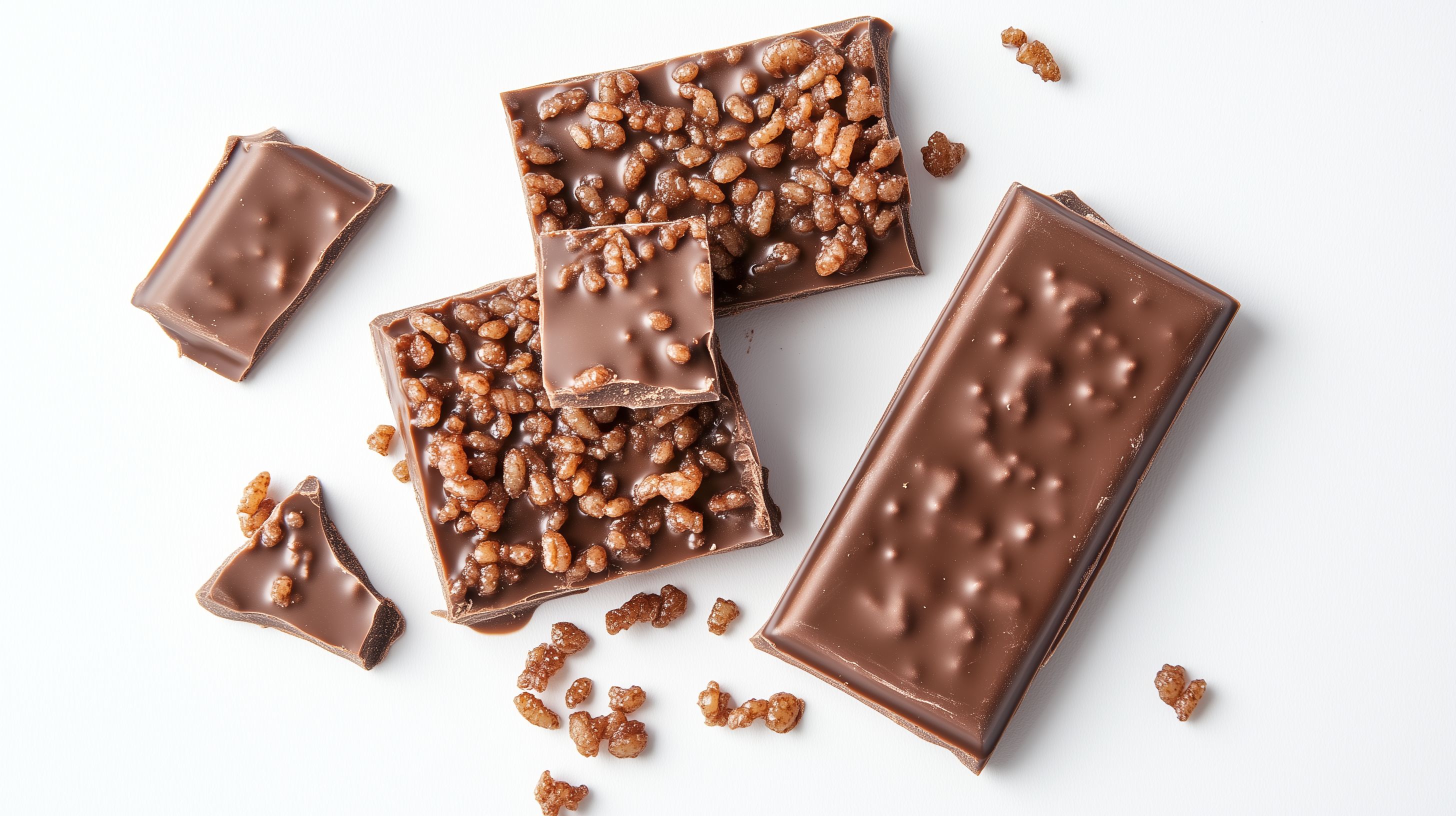 Dieses appetitliche Produktfoto zeigt mehrere knusprige Schokoladentafeln, die mit knusprigen Reiskristallen überzogen sind. Die Tafelstücke sind auf einem weißen Hintergrund angeordnet und bieten eine schöne, freigestellte Ansicht. Die dunkelbraune Schokolade und die leicht goldenen Reiskristalle ergeben einen reizvollen Kontrast und verleihen dem Bild einen hochwertig-dekorativen Charakter. Dieses Stockfoto eignet sich hervorragend für den Einsatz in Werbung, Blogbeiträgen, Newslettern oder Social-Media-Kanälen, wo es die Aufmerksamkeit der Betrachter auf sich ziehen und Appetit auf die leckeren Schokoladensnacks machen kann. Das Foto ist in hoher Auflösung verfügbar und steht unter einer Creative-Commons-Lizenz zur Verfügung.