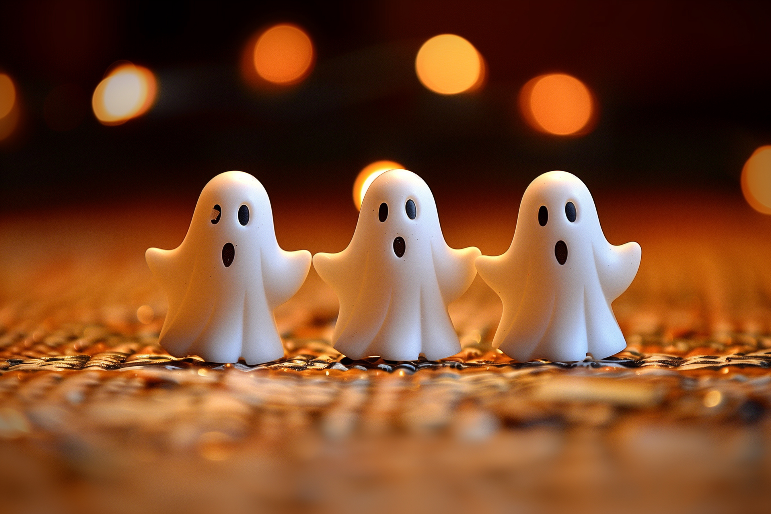 Das Foto zeigt drei niedliche weiße Geister-Figuren auf einem Hintergrund aus glitzernden goldenen Münzen. Die Geister haben große, ausdrucksstarke Augen und sind vor einem Bokeh aus orangefarbenen Lichtern zu sehen, was eine stimmungsvolle Halloween-Atmosphäre schafft.