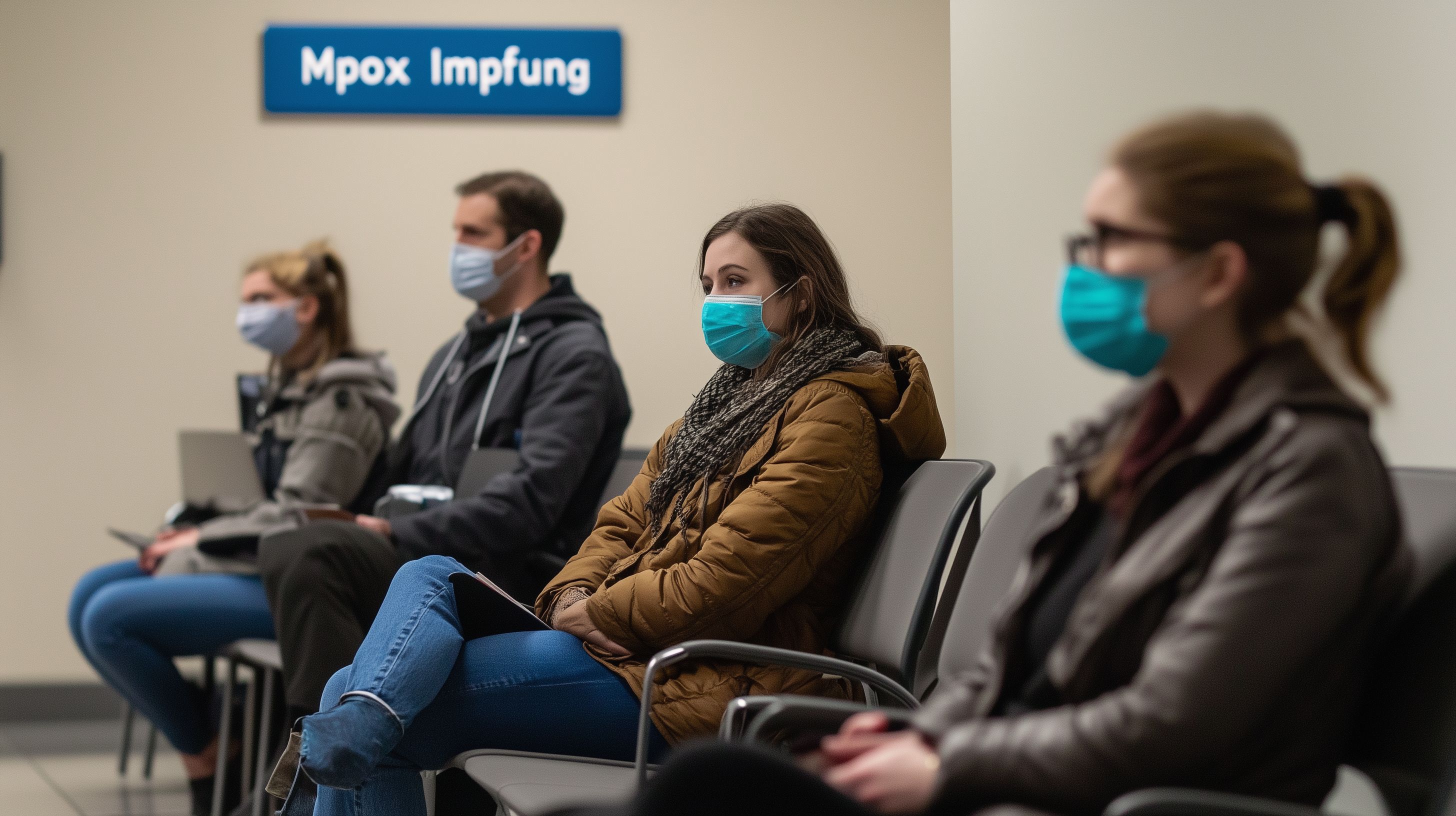 Das Bild zeigt eine Gruppe von Menschen, die offenbar auf ihre Affenpocken-Impfung in einem Impfzentrum warten. Sie sitzen auf Stühlen in einem Warteraum, die meisten von ihnen tragen Mund-Nasen-Schutzmasken. Im Hintergrund ist eine Beschilderung für die 'Mpox Impfung' zu sehen. Das Foto vermittelt einen Eindruck von der aktuellen Situation in Bezug auf die Affenpocken-Pandemie und den Bedarf an entsprechenden Impfungen. Als kostenloses, hochauflösendes Stockfoto unter Creative-Commons-Lizenz eignet es sich hervorragend für Beiträge in Blogs, Newslettern oder zur Verwendung in sozialen Medien rund um das Thema Gesundheit und Prävention.