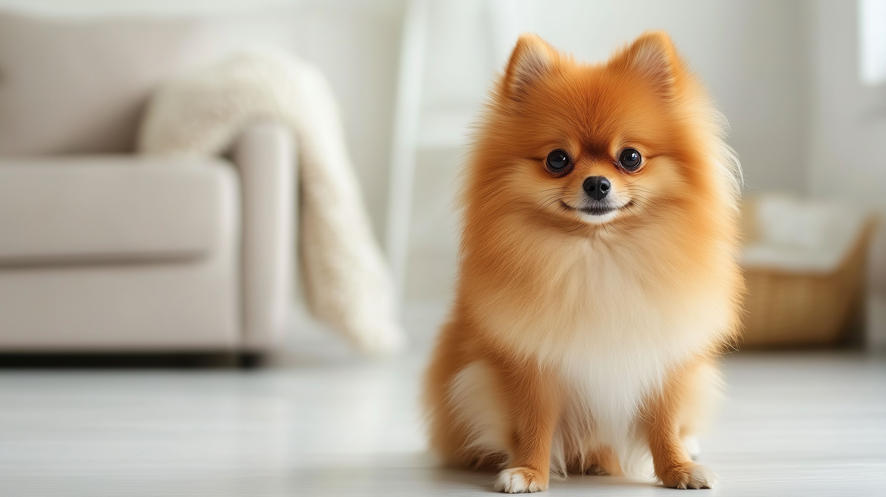 Das Bild zeigt einen niedlichen Pommeraner-Welpen, der in einem modern eingerichteten Wohnzimmer posiert. Der Hund sitzt auf einem hellen Sofa und blickt direkt in die Kamera, was den Betrachter mit seinem freundlichen Gesichtsausdruck und seiner flauschigen Fellstruktur fesselt. Die helle Einrichtung mit Holzböden, Teppich und großen Fensterfront bildet einen stimmungsvollen Hintergrund für das Hundeporträt.