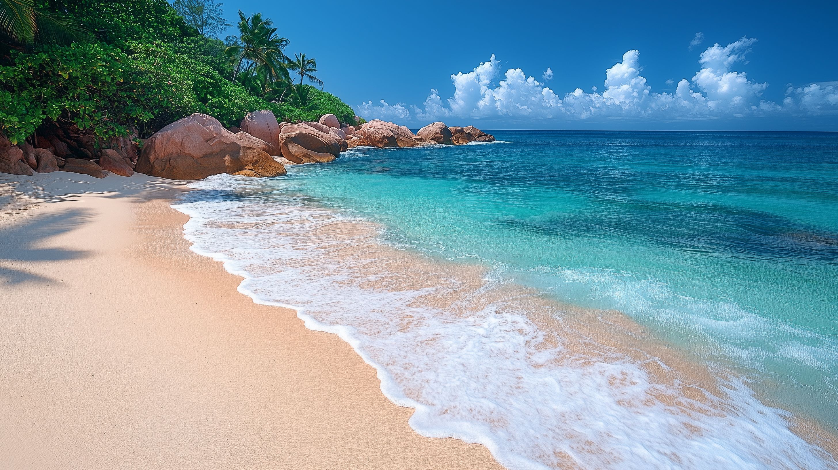 Das Foto zeigt einen atemberaubenden, unberührten Sandstrand auf den Seychellen. Die kristallklaren, türkisfarbenen Wellen rollen sanft an den goldenen Strand, der von einer üppigen, tropischen Vegetation umrahmt wird. Prachtvolle Palmen säumen den Strand, während der tiefblaue Himmel mit vereinzelten Wolken ein malerisches Bild zeichnet. Die Kombination aus Ruhe, Schönheit und Entspannung macht dieses Foto zu einem perfekten Eyecatcher für Reiseanbieter, Tourismus-Blogs oder Werbematerialien rund um Urlaubsreisen in ferne, paradiesische Gefilde. Dieses hochauflösende Stockfoto steht unter der Creative-Commons-Lizenz zur kostenlosen Verwendung zur Verfügung.