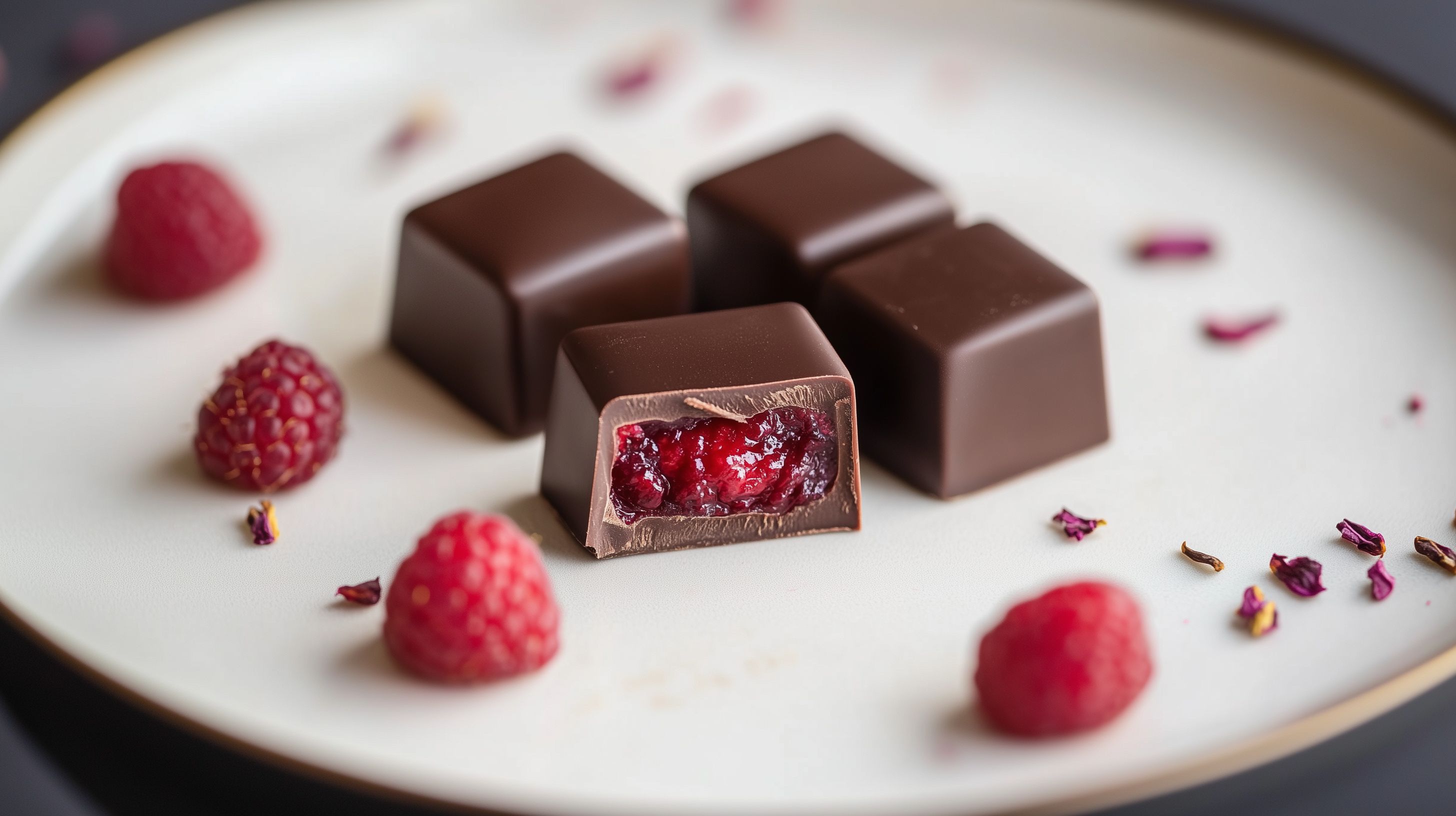 Das Bild zeigt ein stimmungsvolles Arrangement von dunklen Schokoladenwürfeln mit einer Füllung aus leckerem Himbeerragout. Die Würfel sind auf einem weißen Teller angerichtet, umgeben von frischen Himbeeren und einzelnen Rosenblüten. Die Komposition besticht durch den Kontrast zwischen dem dunklen Schokoladenbraun und dem kräftigen Rot der Beeren, die das Bild mit ihrer natürlichen Frische beleben. Diese hochwertige Stockfoto-Aufnahme eignet sich hervorragend für die Verwendung in kulinarischen Blogs, Rezeptsammlungen, Newslettern oder Werbekampagnen zum Thema Schokolade und feine Patisserie. Das Foto ist in hoher Auflösung verfügbar und kann unter einer Creative-Commons-Lizenz kostenfrei genutzt werden.