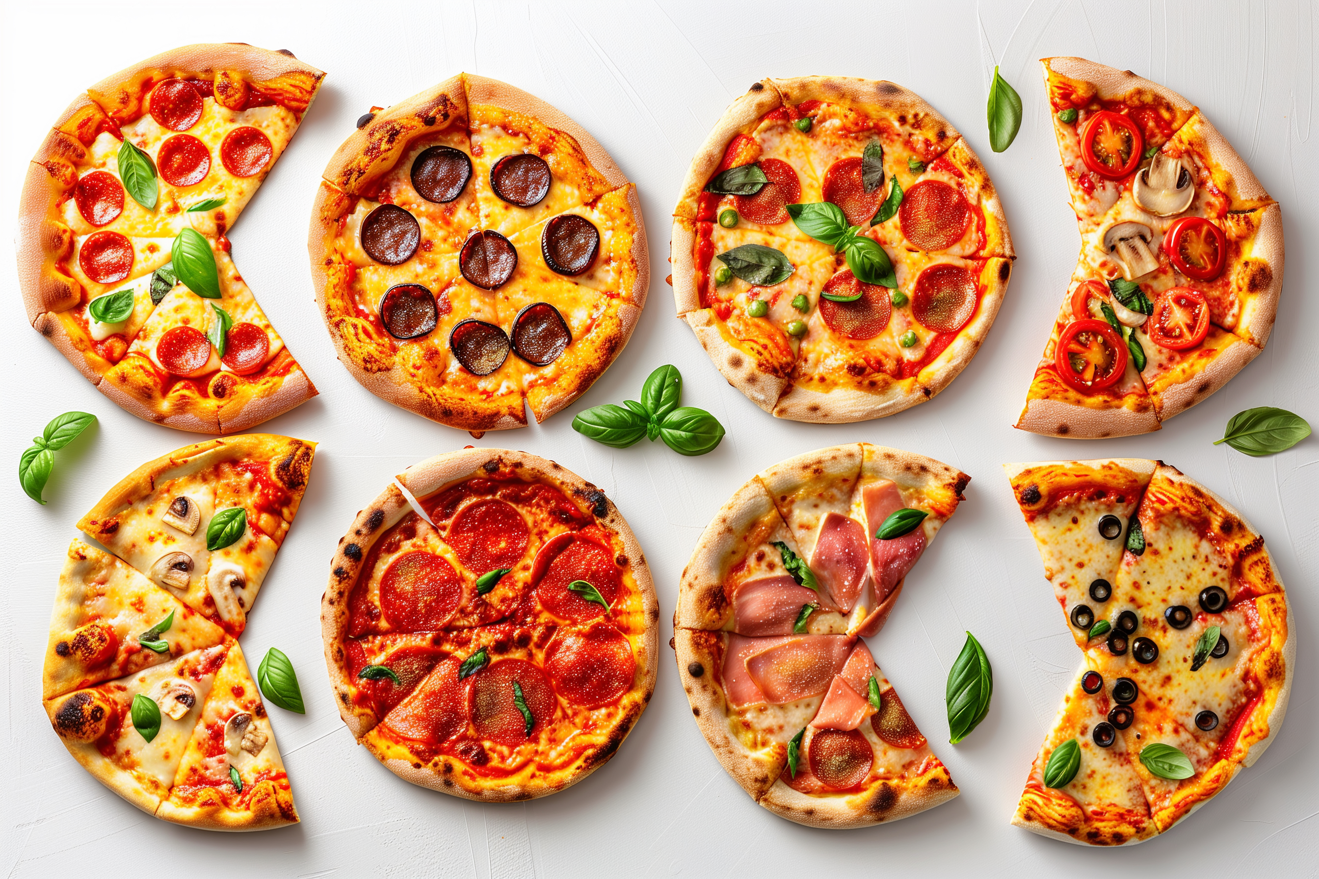 Dieses Stockfoto zeigt eine Vielzahl an verschiedenen Pizzen auf einem hellen Hintergrund. Die Pizzen haben unterschiedliche Beläge wie Tomaten, Pilze, Oliven, Salami und Basilikum. Die Perspektive und Anordnung der Pizzascheiben lassen das Foto lebendig und appetitlich wirken. Dieses hochauflösende, kostenlose Stockfoto unter Creative-Commons-Lizenz eignet sich perfekt für Verwendungen in Blogs, Newslettern, auf Social-Media-Kanälen oder in Werbematerialien rund um das Thema Gastronomie, Italienische Küche oder Fastfood.