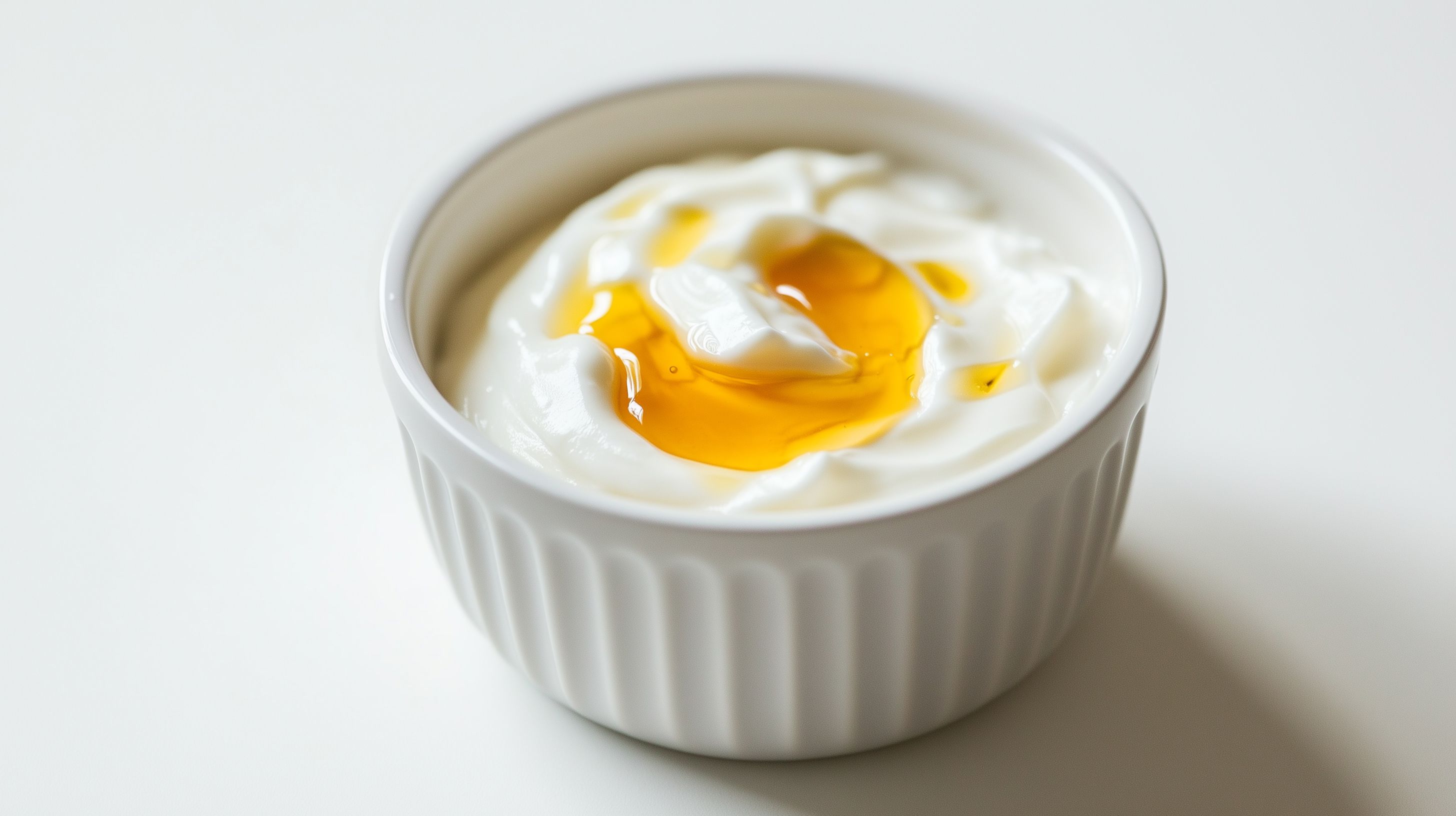 Das Foto zeigt eine köstliche Dessertkreation in einer weißen Schale. Im Mittelpunkt befindet sich ein Kugel aus cremig-weißem Naturjoghurt, die mit einem goldgelben Tropfen Honig verziert ist. Die natürlichen Farben und der einfache, minimalistische Stil machen dieses Stockfoto zu einem vielseitig einsetzbaren Bild für Blogs, Social-Media-Beiträge, Newsletter und Werbematerialien zum Thema Frühstück, Snacks oder gesunde Ernährung. Das hochauflösende Foto ist kostenfrei unter einer Creative-Commons-Lizenz verfügbar.