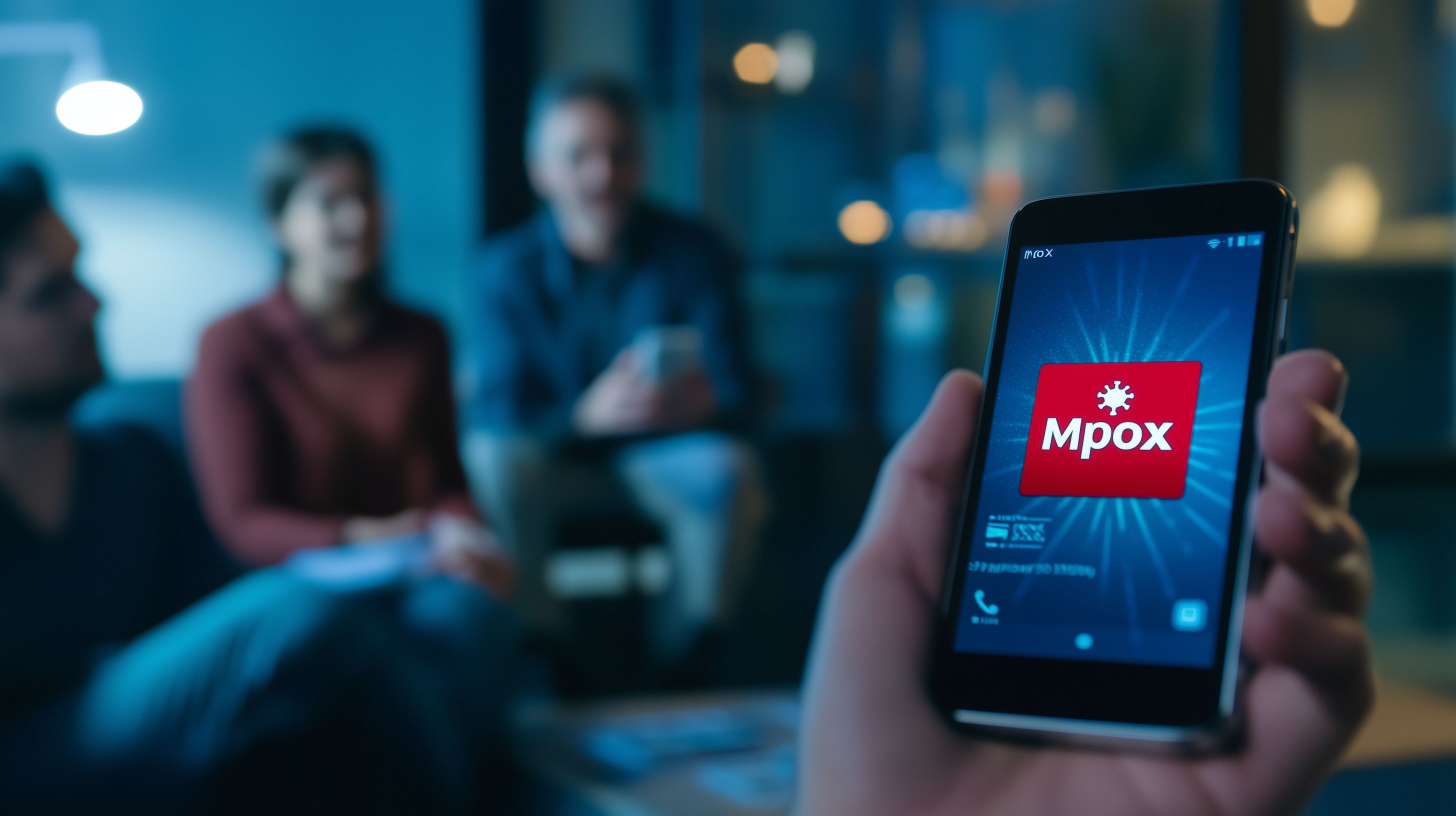Das Bild zeigt ein Smartphone, auf dem die Warnung vor Affenpocken (Mpox) auf einem dunkel gehaltenen Hintergrund mit verschwommenen Personen im Hintergrund zu sehen ist. Die Perspektive ist direkt auf das Smartphone gerichtet, was den Fokus auf die digitale Kommunikation und Gesundheitsthematik lenkt. Die Farbgebung in Blautönen und das nächtliche Setting erzeugen eine ernsthafte und sorgenvolle Stimmung, die zum Thema passt.