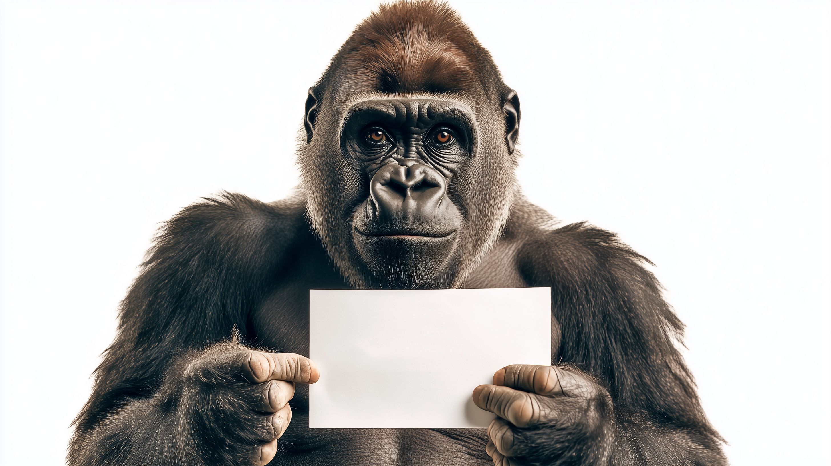Das Bild zeigt einen imposanten Gorilla, der einen leeren weißen Schild vor sich hält. Der Gorilla blickt den Betrachter direkt an, mit einem ernsten Gesichtsausdruck. Das Bild ist vor einem weißen Hintergrund aufgenommen, wodurch der Gorilla perfekt in Szene gesetzt wird und die Aufmerksamkeit ganz auf ihn gelenkt wird.
