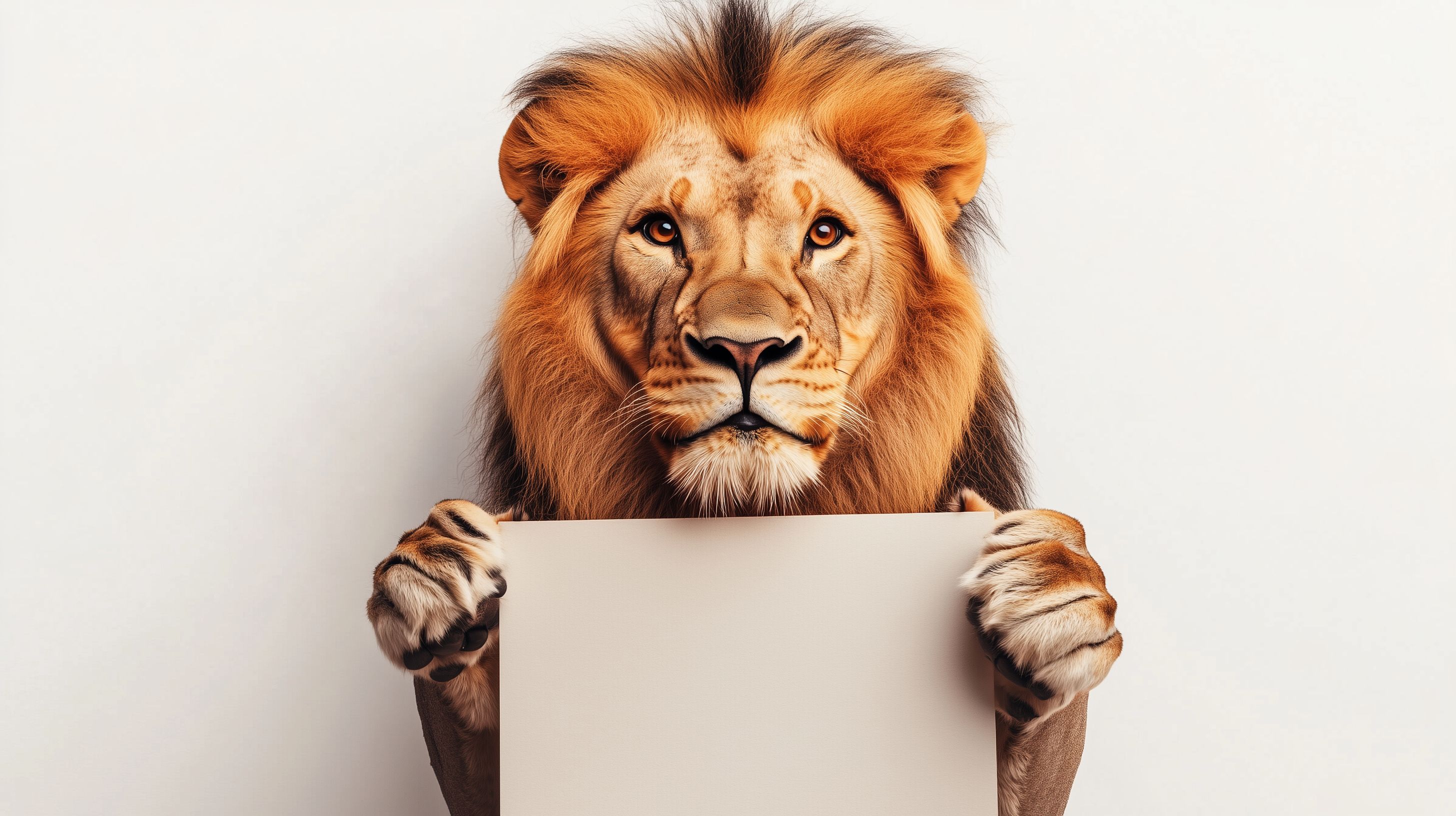 Das Bild zeigt ein beeindruckendes Porträt eines Löwen, der einen weißen Karton vor sich hält. Der Fokus liegt auf dem mächtigen Kopf des Löwen mit seinen ausdrucksstarken Augen und der imposanten Mähne. Der Kontrast zwischen dem kraftvollen Raubtier und dem einfachen, weißen Hintergrund erzeugt eine starke visuelle Wirkung. Dieses Stockfoto eignet sich hervorragend für die Verwendung in Werbe- und Marketingmaterialien, Blogbeiträgen, Social-Media-Posts und vielen anderen Kontexten, in denen ein markantes, hochwertiges Foto mit Tierbezug gewünscht ist. Das Bild ist in hoher Auflösung verfügbar und unter einer Creative-Commons-Lizenz nutzbar.