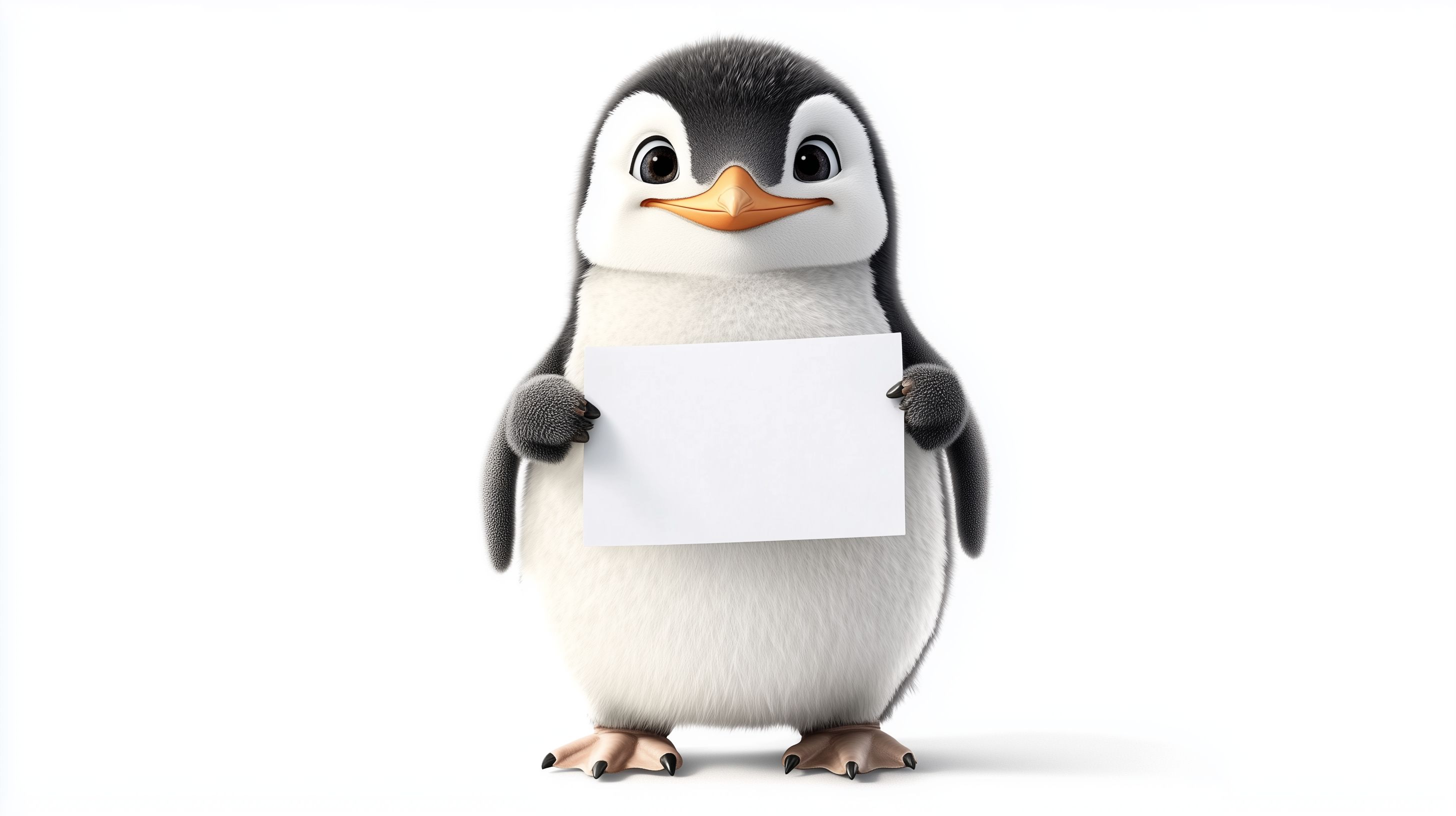 Das Bild zeigt einen niedlichen, cartoon-artigen Pinguin, der ein weißes Schild in seinen kleinen Flügeln hält. Der Pinguin hat große, ausdrucksstarke Augen und einen fröhlichen Gesichtsausdruck, der den Betrachter direkt anzuspricht. Der einfache, weiße Hintergrund lenkt den Fokus komplett auf den Pinguin und sein Schild, was eine sehr klare und minimalistisch gestaltete Komposition ergibt. Dieses Bild eignet sich hervorragend als fröhlicher, sympathischer Eyecatcher für Werbung, Blogs, Social-Media-Beiträge oder Präsentationen. Als kostenloses Stockfoto in hoher Auflösung und unter Creative-Commons-Lizenz kann es vielseitig eingesetzt werden.