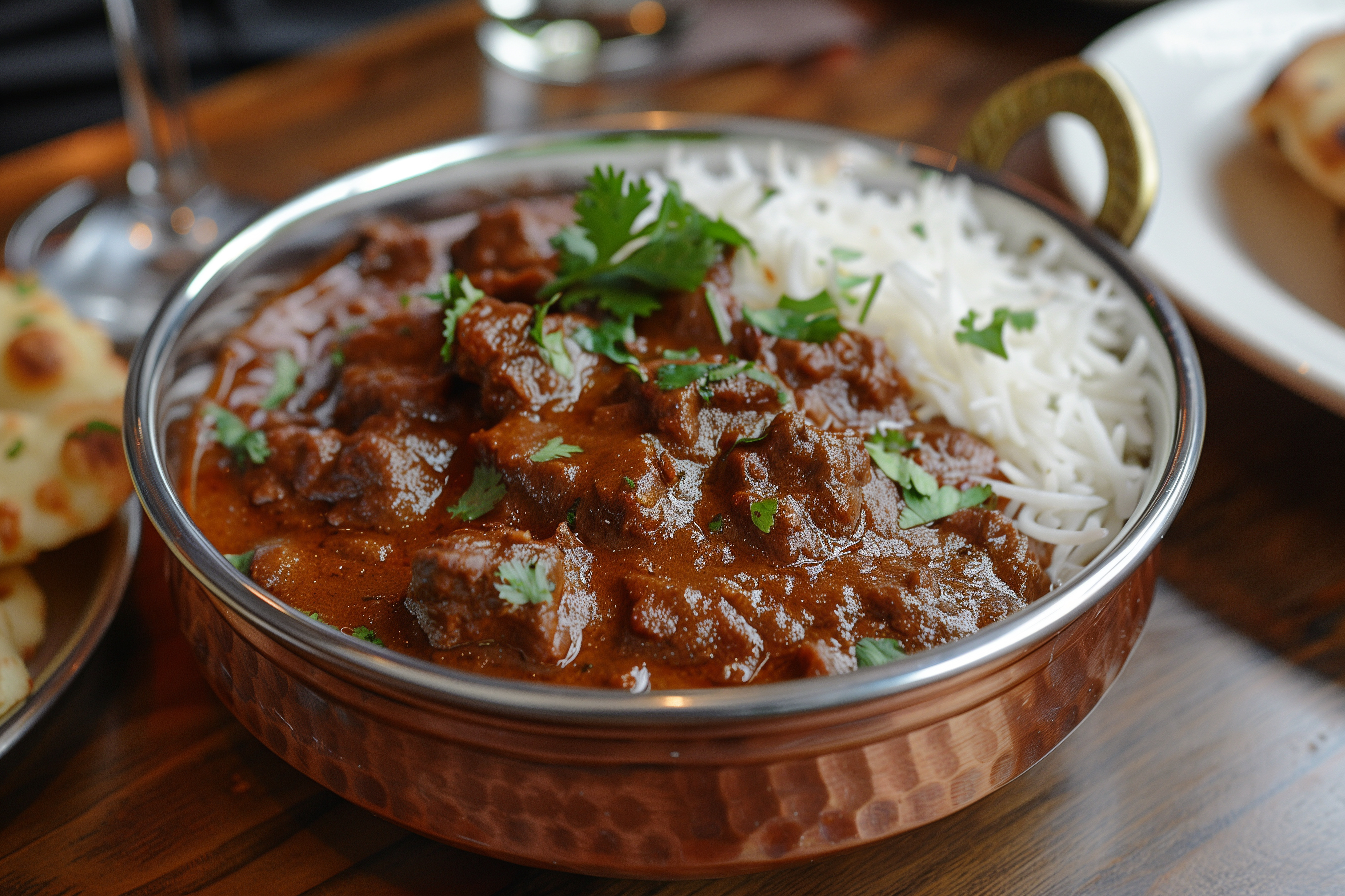 Dieses Foto zeigt einen appetitlich angerichteten, würzigen indischen Rindfleisch-Curry, der mit Reis und grünen Korianderzweigen serviert wird. Der Curry ist in einem Kupfer-Teller angerichtet und wird vor einem dunklen Holztisch präsentiert. Die Farbkombination aus den dunklen Curryfarben, dem weißen Reis und dem frischen Grün des Korianders sorgt für einen stimmungsvollen, einladenden Auftritt. Dieses hochwertige Stockfoto eignet sich hervorragend für Blogs, Newsletter, Social-Media-Beiträge oder Werbematerialien rund um indische Küche, Rezepte und Gastronomie. Das Foto ist in hoher Auflösung verfügbar und unter der kostenlosen Creative-Commons-Lizenz nutzbar.