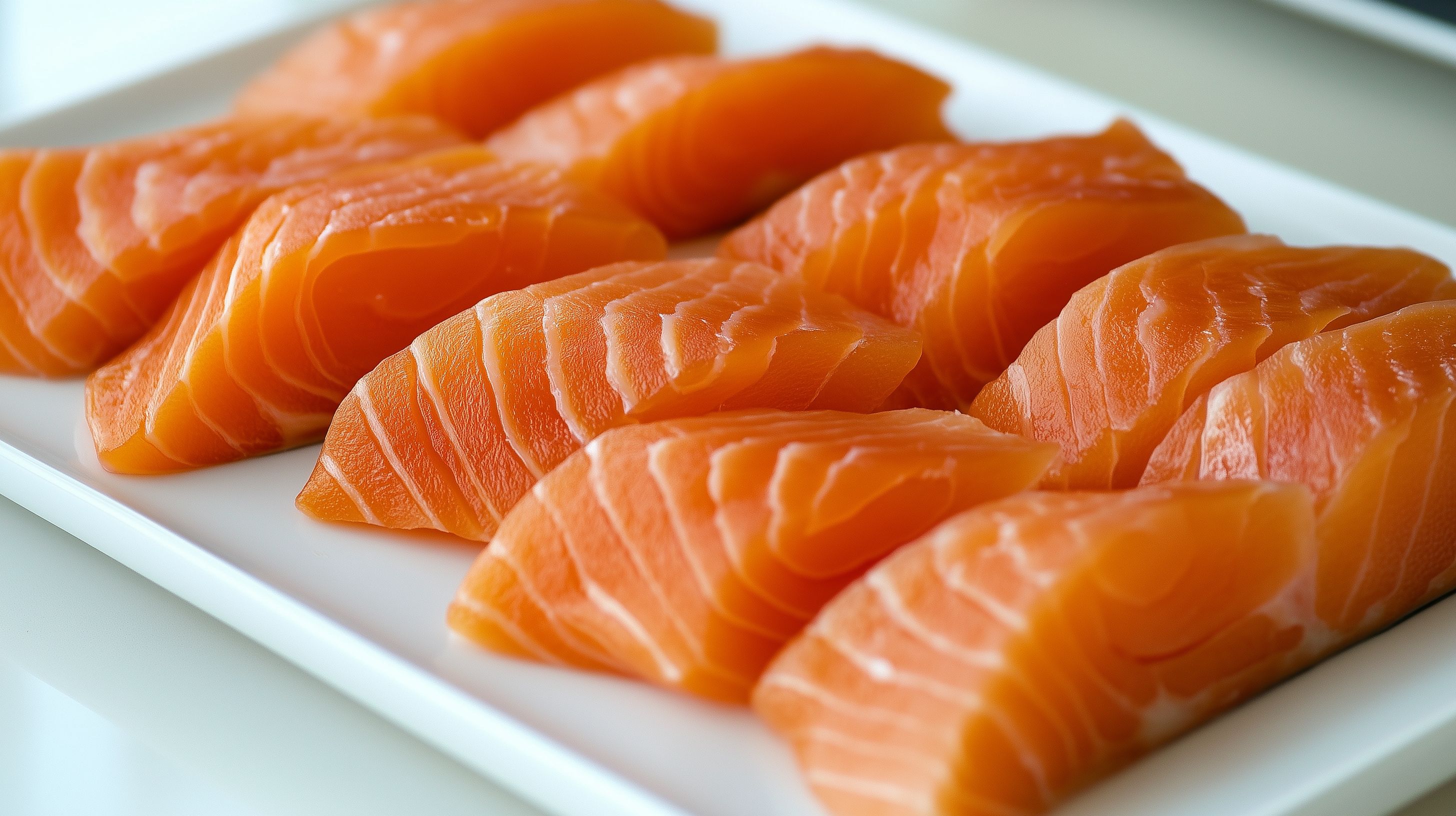 Das Bild zeigt eine Nahaufnahme von frisch zubereiten Lachsfilets auf einem weißen Teller. Die leuchtend orangefarbenen Fischstücke sind sauber in Scheiben geschnitten und übersichtlich auf dem Teller angeordnet. Der weiße Hintergrund lässt die Farbe und Textur des Lachses besonders gut zur Geltung kommen. Dieses frische, hochwertige Produktfoto eignet sich hervorragend für die Verwendung in Kochrezepten, Foodblogs, Restaurants-Websites oder Werbekampagnen für Seafood und gesunde Ernährung. Als hochwertiges, kostenloses Stockfoto in hoher Auflösung steht es unter der Creative-Commons-Lizenz zur freien Verwendung zur Verfügung.