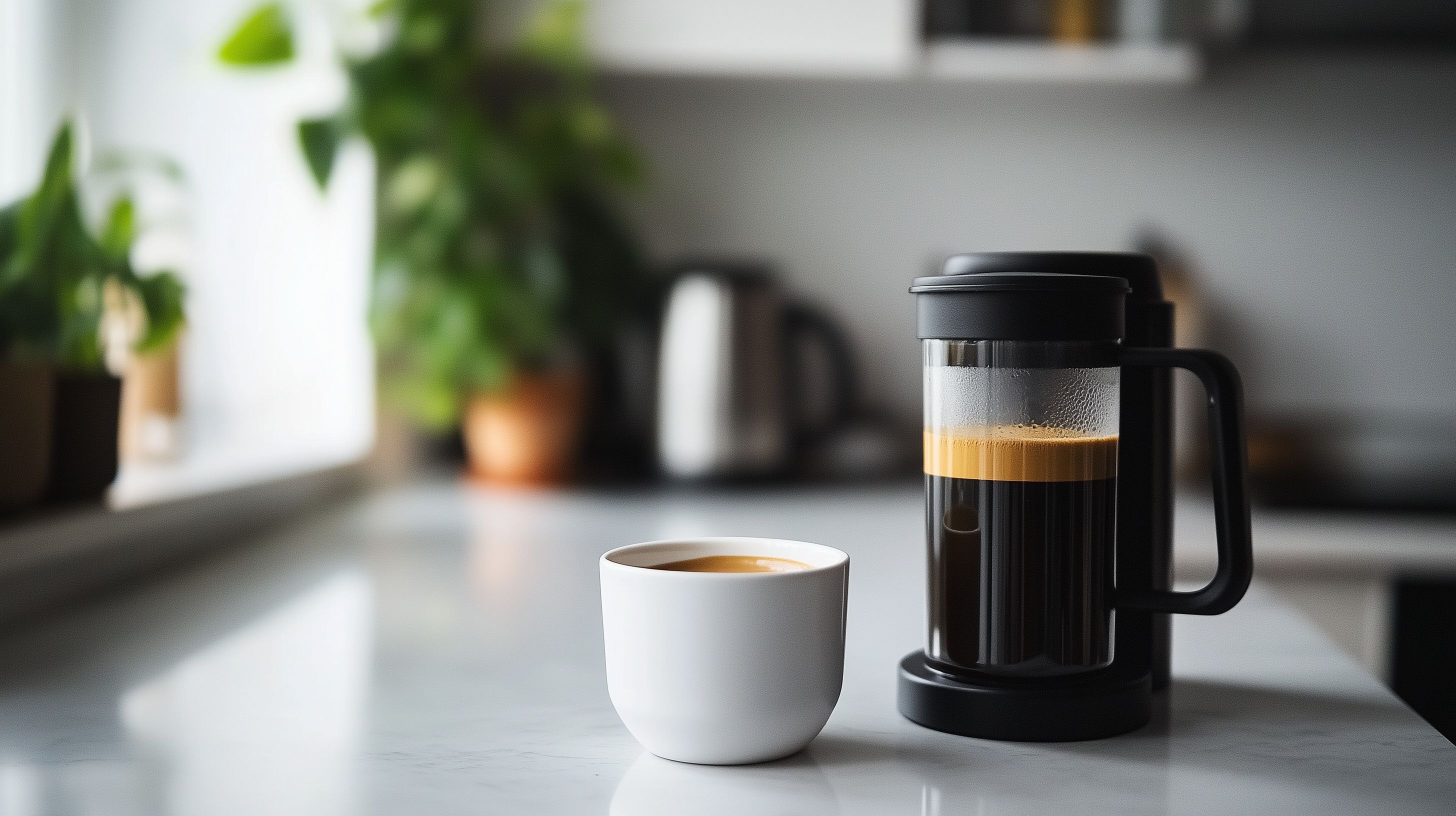 Das Bild zeigt eine weiße Kaffeetasse, die auf einer hellen Küchenarbeitsplatte steht. Daneben befindet sich eine schwarze Aeropress-Kaffeezubereitung, aus der gerade frisch gebrühter Kaffee in die Tasse läuft. Im Hintergrund sind grüne Pflanzen zu sehen, die dem Bild eine natürliche, gemütliche Atmosphäre verleihen. Die Farbkombination von Schwarz, Weiß und Grün schafft einen ruhigen, klaren Gesamteindruck. Dieses Stockfoto eignet sich hervorragend für die Verwendung in Blogs, Newslettern oder sozialen Medien rund um das Thema Kaffee, Frühstück oder Fotografie. Es ist in hoher Auflösung und unter einer Creative-Commons-Lizenz frei nutzbar.