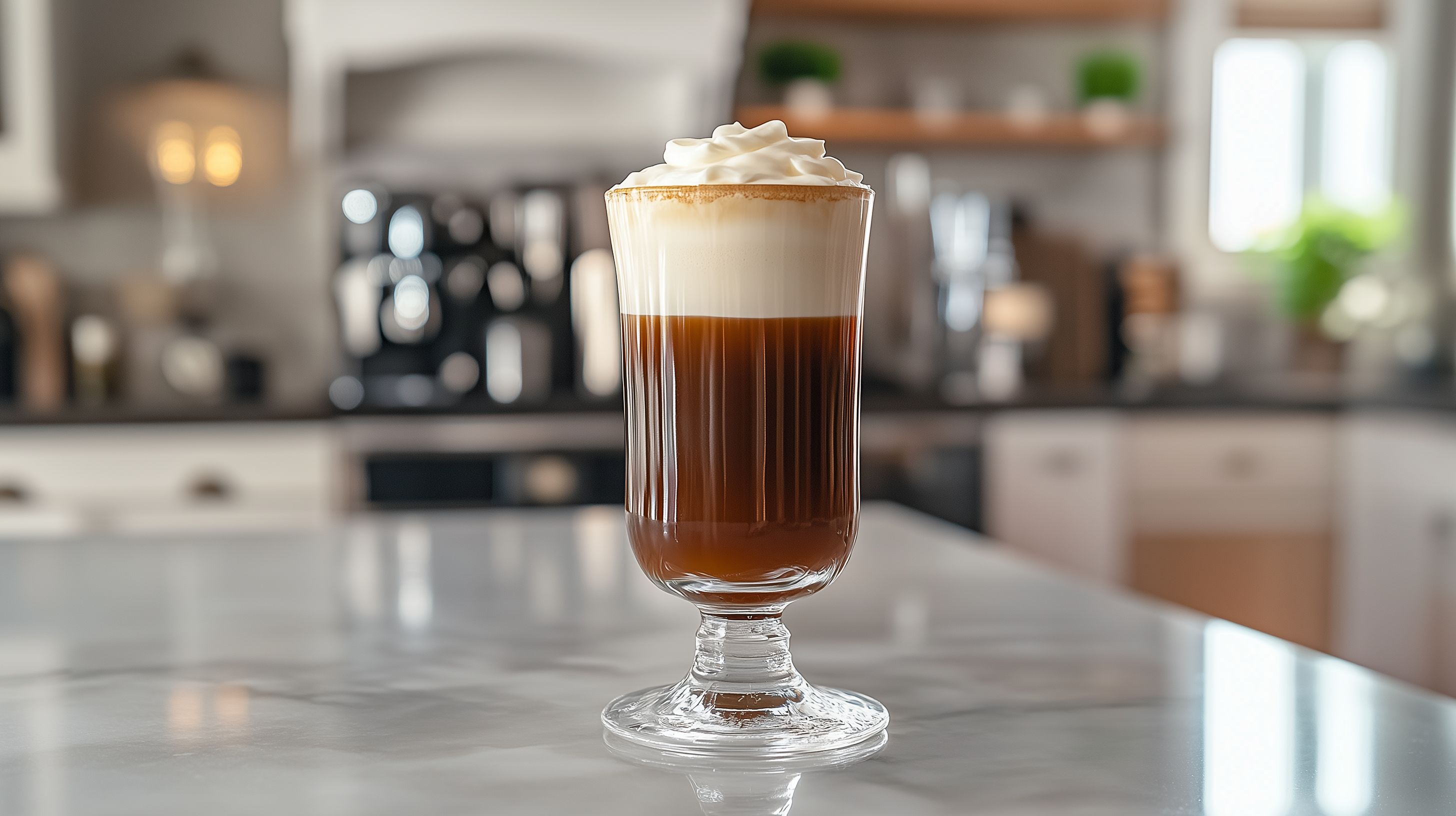 Das Bild zeigt einen Irish Coffee in einem hohen, klaren Glas. Der Kaffee selbst hat eine tief dunkelbraune Farbe und ist mit einer cremigen, weißen Sahnehaube bedeckt. Das Getränk steht auf einer hellen, modernen Küchenoberfläche, die mit Holzelementen und anderen Dekorationsstücken ausgestattet ist. Die Szene vermittelt eine ruhige, gemütliche Atmosphäre und lädt den Betrachter zum Genuss und zur Entspannung ein.