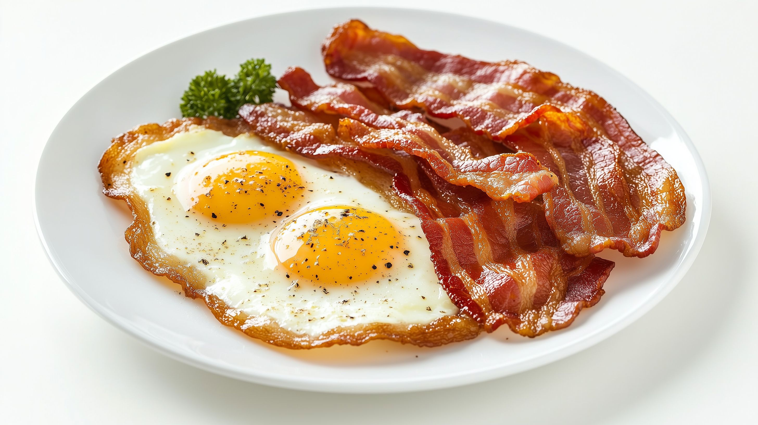 Dieses appetitliche Foto zeigt einen klassischen Speckspiegelei-Teller, der auf einem weißen Porzellangeschirr angerichtet ist. Die beiden goldgelben, cremigen Spiegeleier sind von knusprigen, goldbraunen Speckstreifen umgeben und mit frischen Petersilienblättchen dekoriert. Das Gericht strahlt eine deftige, traditionelle Ästhetik aus und eignet sich hervorragend als Fotomotiv für Kochrezepte, Restaurantmenüs oder Publikationen rund um das Thema Frühstück und Brunch. Dieses hochauflösende Stockfoto ist unter einer Creative-Commons-Lizenz frei nutzbar.