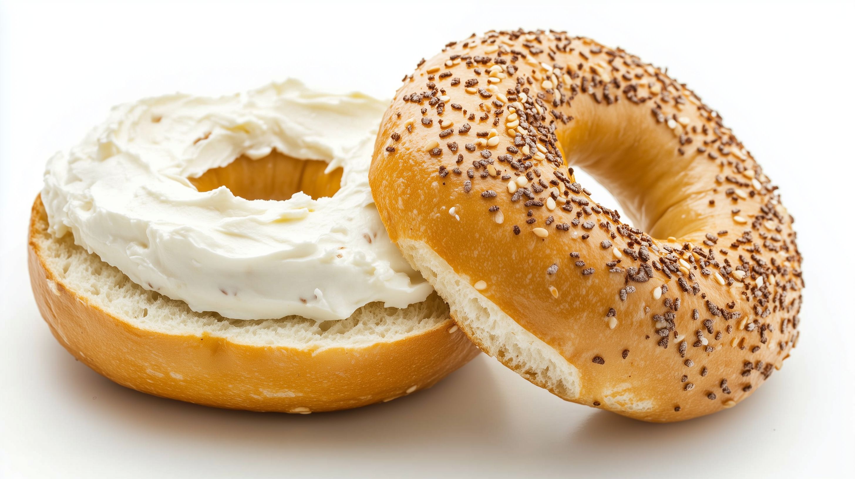 Das Bild zeigt einen frisch belegten Sesam-Bagel mit einer großzügigen Portion cremigen Frischkäse-Topping. Der Bagel hat eine goldbraune, knusprige Oberfläche, die mit kleinen Sesamkörnern bestreut ist. Der Hintergrund ist weiß, wodurch das Motiv klar und appetitlich in Szene gesetzt wird.