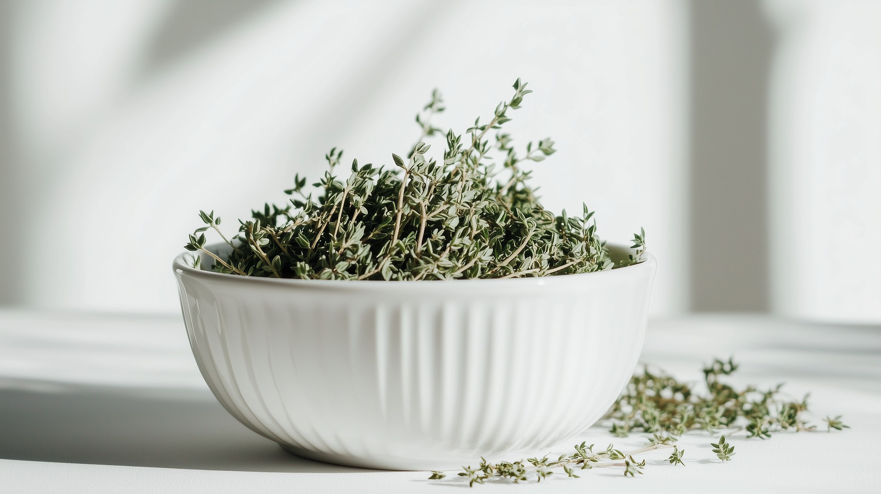 Dieses Foto zeigt eine Nahaufnahme von frisch getrocknetem Thymian in einer weißen, rustikalen Keramikschale. Der Fokus liegt auf den vielen kleinen grünen Thymianblättern, die sich in der Schale befinden. Die Oberfläche und die Farben wirken natürlich und ruhig. Dieses Bild eignet sich hervorragend als Stockfoto für Kochrezepte, Ernährungsartikel oder den Einsatz in Blogbeiträgen, Newslettern und sozialen Medien. Es ist in hoher Auflösung und unter der Creative-Commons-Lizenz frei verwendbar.
