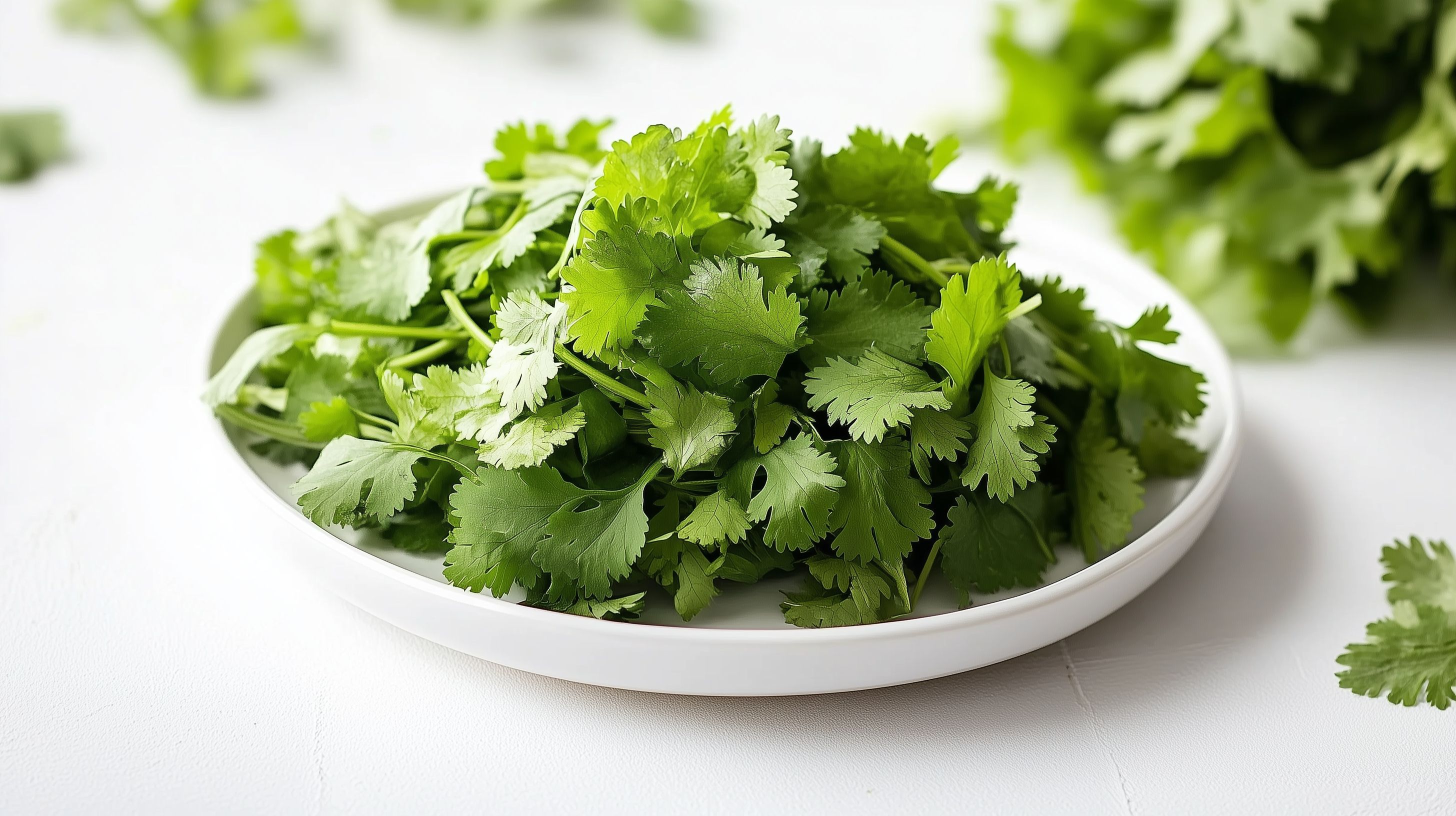 Das Bild zeigt einen Stapel frischer grüner Korianderblätter, die in einer weißen Schüssel präsentiert werden. Die Blätter haben eine leuchtend grüne Farbe und eine zarte, filigrane Struktur. Der Kontrast zwischen dem Grün der Kräuter und der klaren, weißen Farbe der Schüssel erzeugt eine natürliche, appetitliche Optik. Dieses hochauflösende Stockfoto eignet sich hervorragend für die Verwendung in Kochrezepten, Blogbeiträgen zum Thema gesunde Ernährung, Werbematerialien für Lebensmittelprodukte oder Social-Media-Beiträge zu Kulinarik und Kochen. Das Bild steht unter einer Creative-Commons-Lizenz zur Verfügung und kann daher kostenfrei für eine Vielzahl von Zwecken genutzt werden.