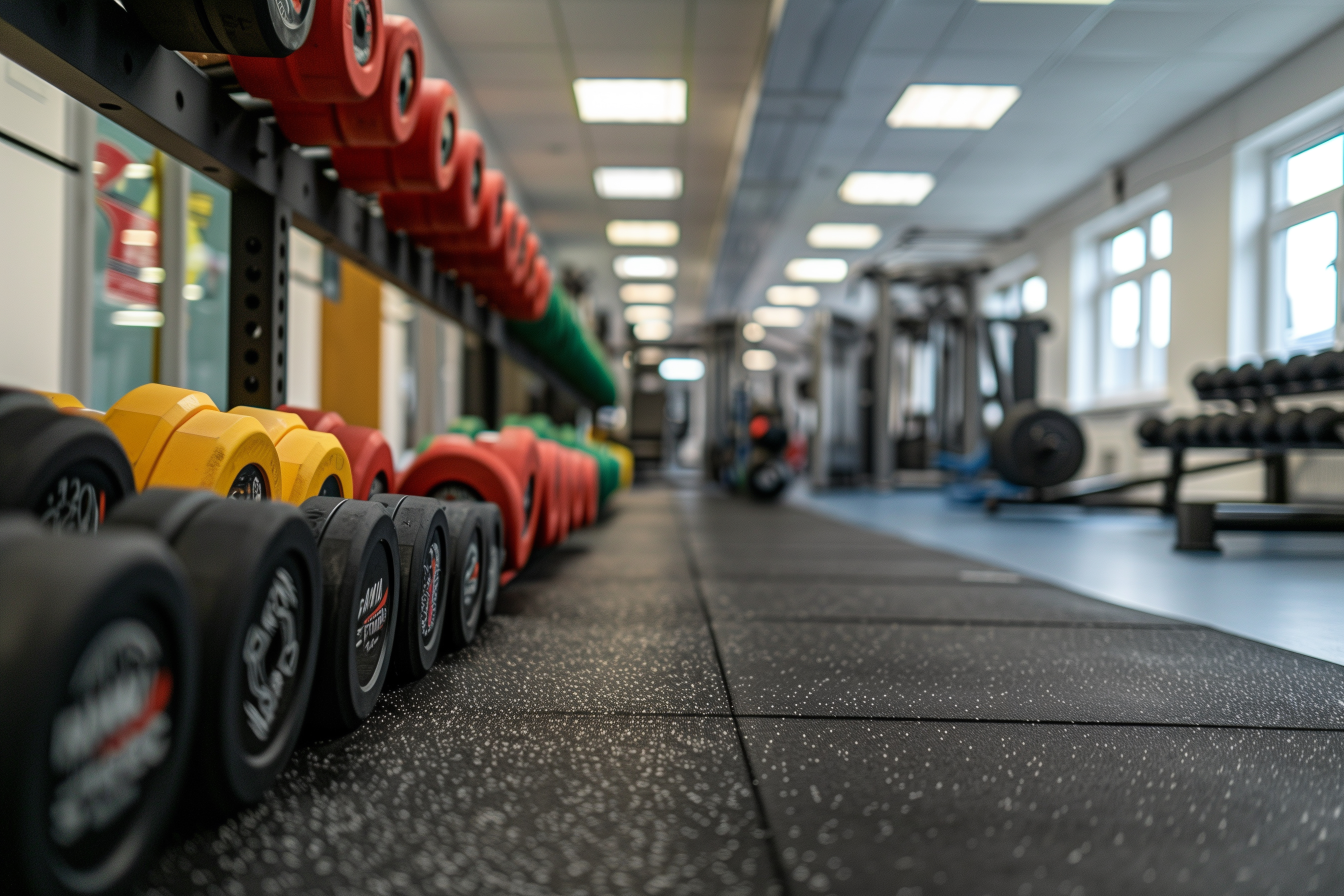 Dieses Foto zeigt einen Ausschnitt aus einem modernen Fitnessstudio. Der Raum ist hell erleuchtet, mit einer Reihe von bunten Gewichtsscheiben und anderen Fitnessgeräten an den Wänden. Der Boden ist mit schwarzen, rutschfesten Fliesen ausgelegt, was eine professionelle und funktionale Atmosphäre schafft. Das Foto lässt sich ideal für Werbe- oder Blogbeiträge zum Thema Fitness, Gesundheit und Wellness einsetzen. Als kostenloses Stockfoto in hoher Auflösung und unter einer Creative-Commons-Lizenz verfügbar, bietet es vielfältige Nutzungsmöglichkeiten für unterschiedliche digitale Kanäle.
