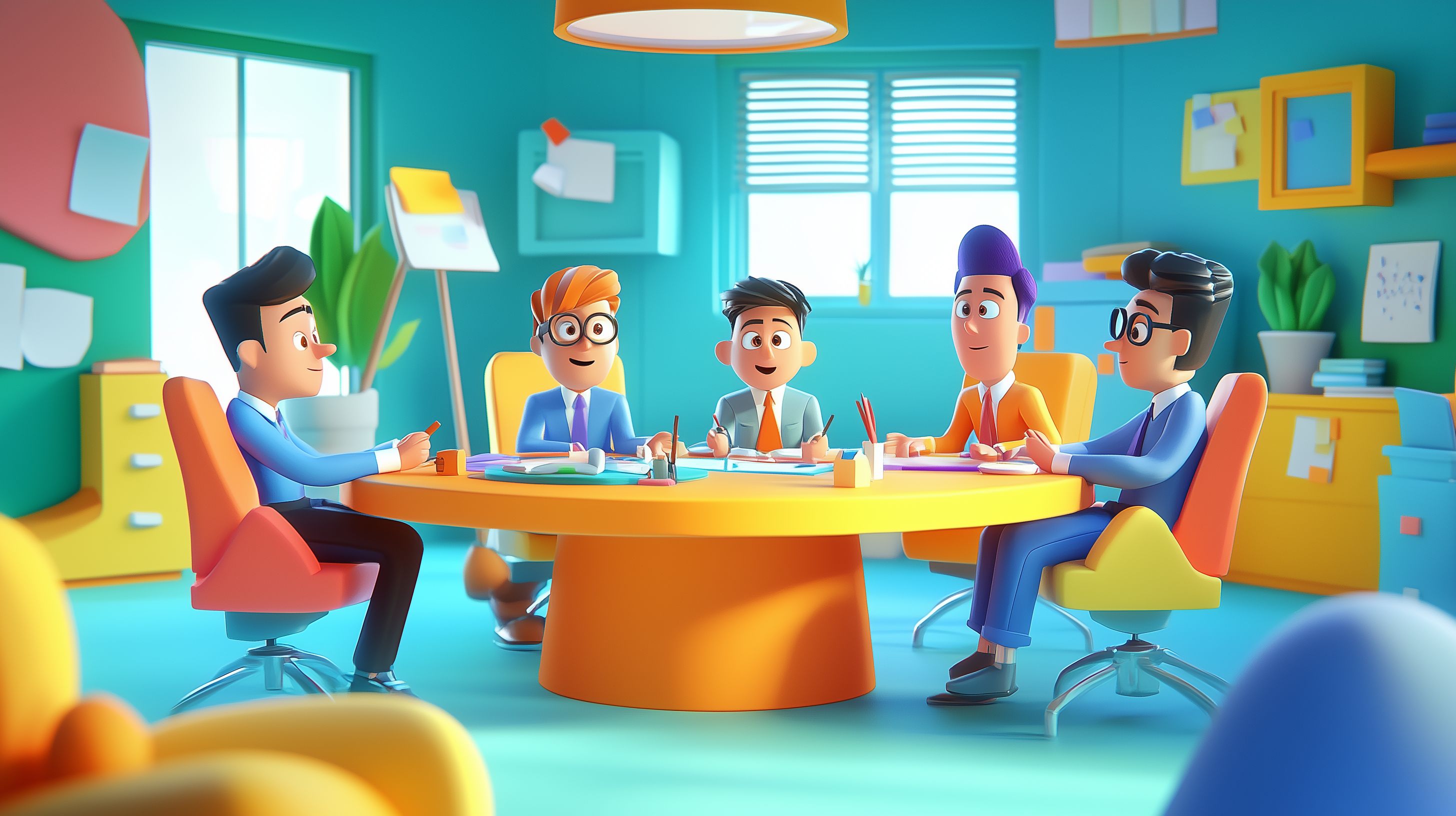 Dieses Stockfoto zeigt eine Besprechungssituation in einem bunten und kreativen Büroumfeld. Zu sehen sind fünf cartoon-ähnliche Bürofiguren an einem runden Tisch, die in einer freundlichen und konzentrierten Arbeitsatmosphäre zusammenkommen. Der Raum ist mit leuchtend farbigen Möbeln, Pflanzen und Dekorationselementen gestaltet, was eine anregende Arbeitsumgebung vermittelt. Das Foto eignet sich hervorragend als Motiv für Blogs, Social Media-Posts oder Werbematerialien zum Thema Teamwork, Kreativität und innovatives Arbeiten. Das hochauflösende Bild steht unter einer Creative Commons-Lizenz kostenlos zur Verfügung.