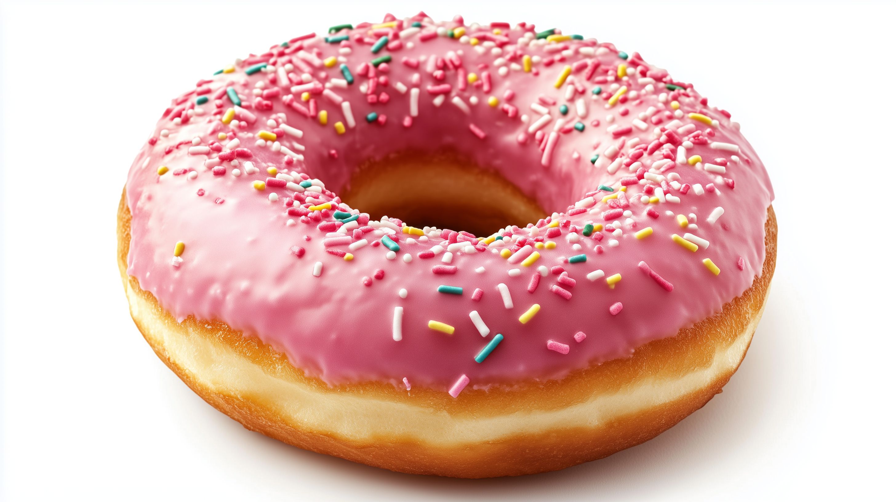 Das Bild zeigt einen leckeren, rosa Donut mit bunten Streuseln. Der Donut ist vor weißem Hintergrund platziert, sodass der Fokus ganz auf der detaillierten Aufnahme liegt. Der Zuckerguss und die leuchtenden Streusel verleihen dem Gebäck einen einladenden und appetitlichen Eindruck. Dieses hochauflösende Stockfoto eignet sich hervorragend für die Verwendung in Blogs, Newslettern, Social-Media-Beiträgen oder Werbematerialien rund um das Thema Süßigkeiten, Backwaren und Café-Menüs. Das Foto steht unter einer Creative-Commons-Lizenz zur freien Nutzung zur Verfügung.