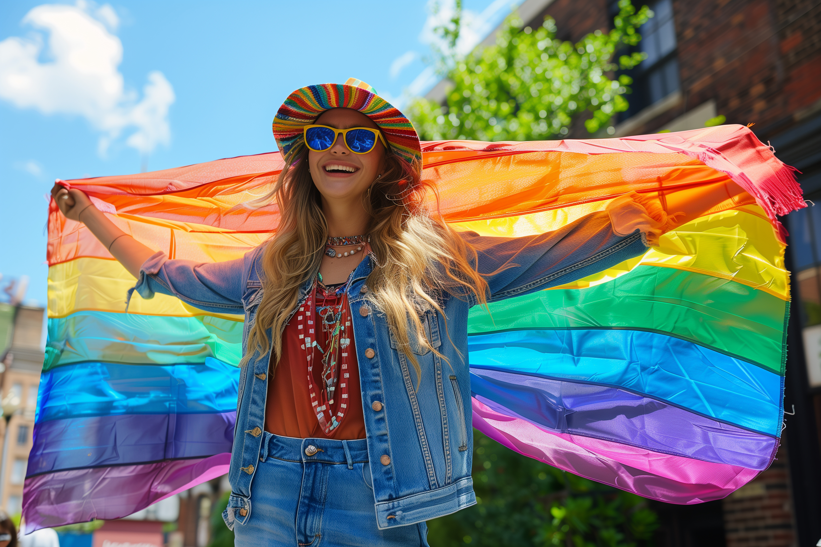 Das Bild zeigt eine fröhliche junge Frau, die eine bunte Regenbogenfahne ausgebreitet hält und dabei selbst in einen bunt zusammengestellten Hippie-Look gekleidet ist. Sie trägt eine Sonnenbrille mit bunter Fassung, ein farbiges Kopftuch und eine Jeansjacke, die gut zu dem farbenfrohen Gesamtbild passt. Der Hintergrund zeigt eine grüne, sommerliche Umgebung mit Backsteingebäuden. Insgesamt vermittelt das Foto ein Gefühl von Freiheit, Lebenslust und Stolz. Das hochauflösende Bild eignet sich hervorragend für Blogs, Social-Media-Beiträge, Newsletter oder Werbung rund um Themen wie Vielfalt, Feierlichkeiten und sommerliche Stimmung. Es steht als kostenloses Stockfoto unter Creative-Commons-Lizenz zur Verfügung.