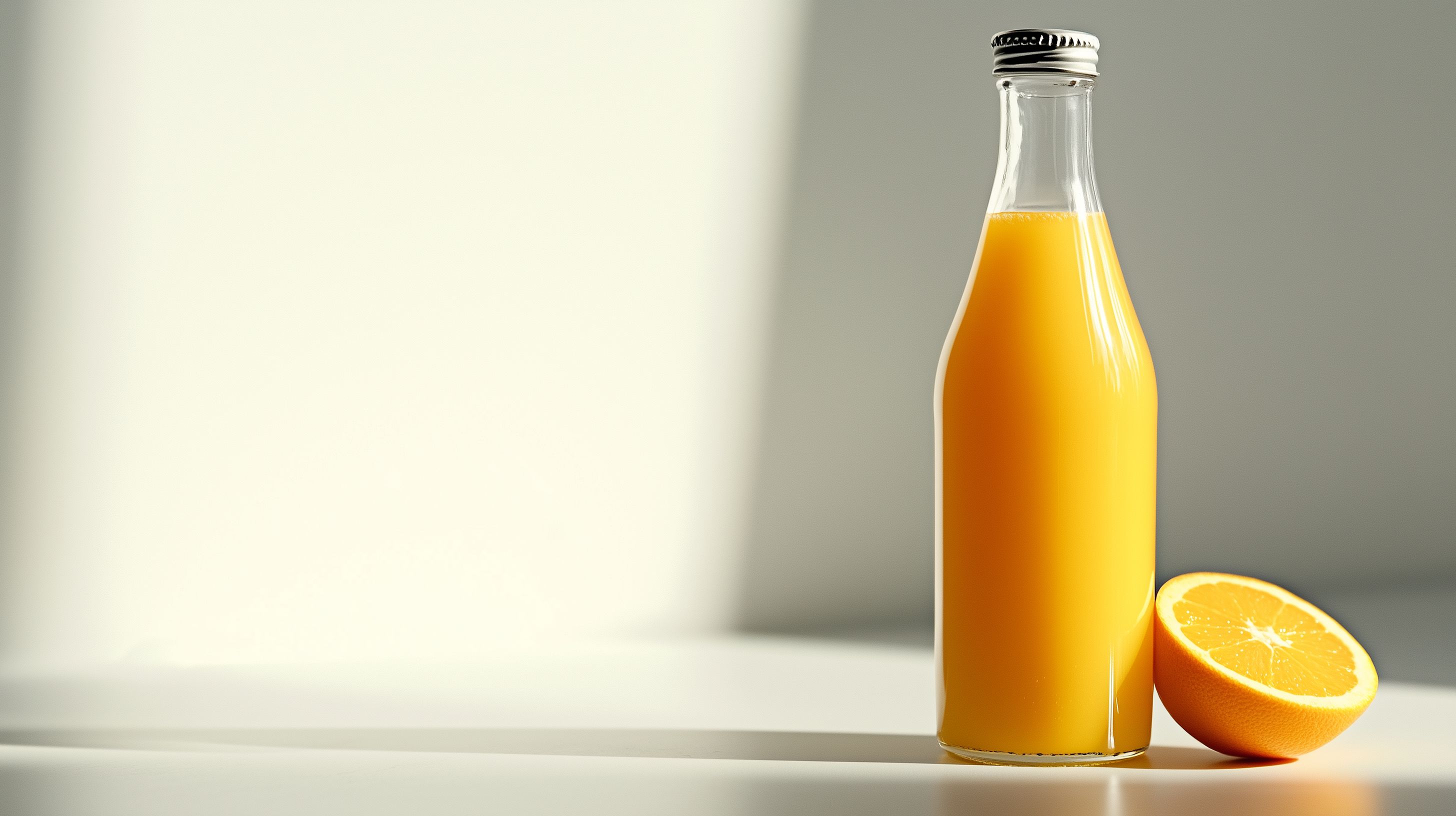 Dieses stimmungsvolle Foto zeigt eine Glasflasche mit frisch gepresstem Orangensaft vor einem hellen Hintergrund. Die leichte Beleuchtung von der Seite lässt die orangefarbene Flüssigkeit und die angeschnittene Orange natürlich und einladend erscheinen. Mit seiner reduzierten, minimalistischen Komposition eignet sich das Bild perfekt als kostenloses Stockfoto für die Verwendung in Blogs, Newslettern, Social-Media-Beiträgen oder Werbematerialien rund um die Themen Gesundheit, Ernährung und Erfrischung. Das hochauflösende Foto ist unter der Creative-Commons-Lizenz frei nutzbar.