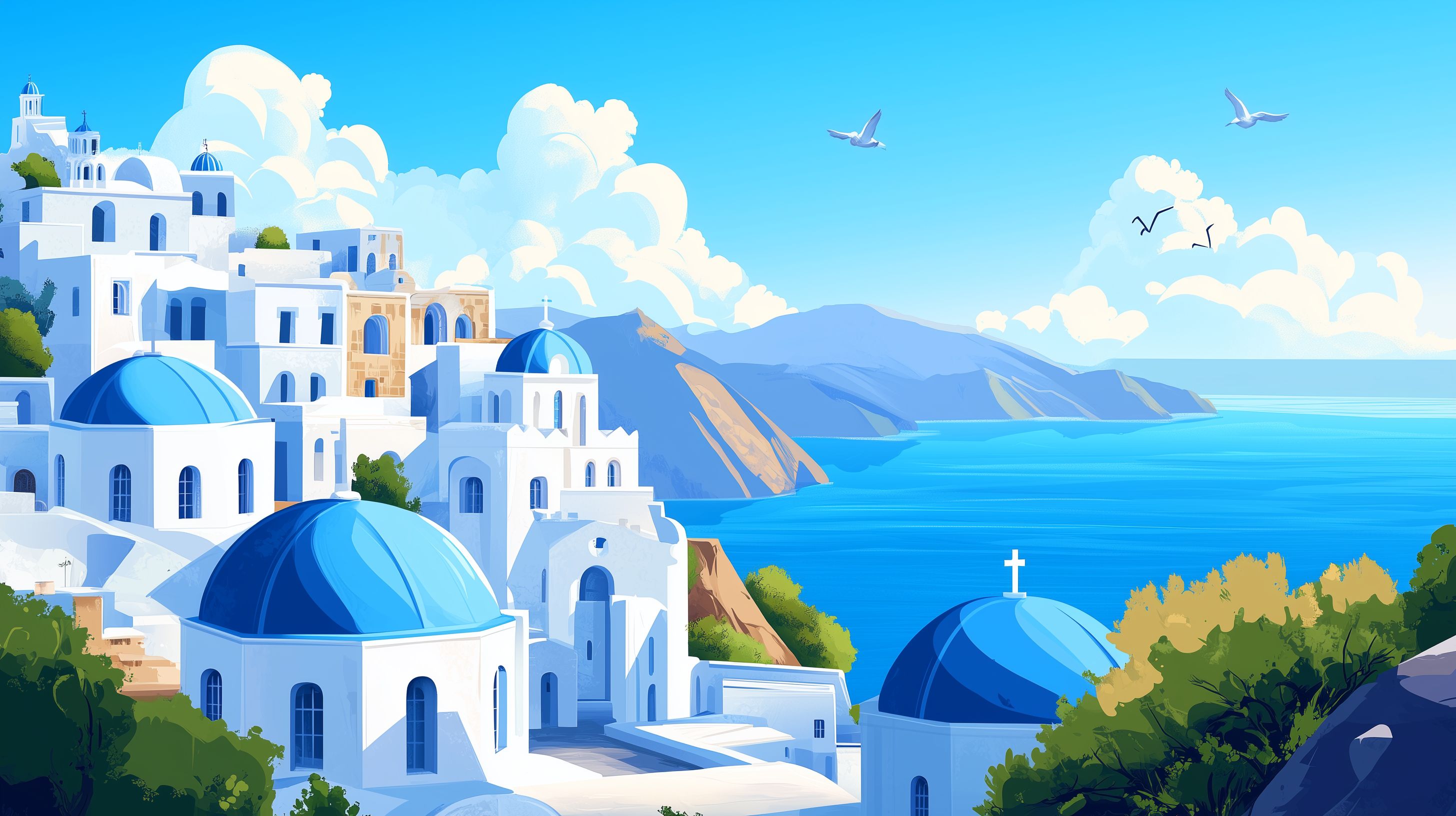 Diese wunderschöne Illustration zeigt die malerische Küstenstadt Santorini auf der griechischen Insel Santorin. Die charakteristischen weißen Häuser mit blauen Dächern und Kuppeln thronen auf steilen Klippen über dem türkisblauen Meer. Im Hintergrund ragen imposante Berge auf, während Möwen über der idyllischen Szenerie kreisen. Das Bild vermittelt den typischen Stil und die Farbgebung der Kykladeninsel und eignet sich hervorragend als Hintergrundbild, für Präsentationen, Websites oder den Einsatz in kreativen Projekten. Das hochauflösende, vektorbasierte Stockfoto steht unter einer kostenlosen Creative-Commons-Lizenz zur Verfügung.