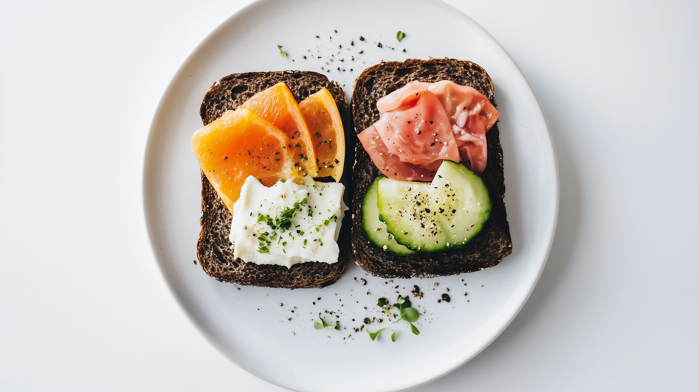 Dieses Foto zeigt einen kreativen, gesunden Snack auf Dunkelbrot. Das Bild präsentiert eine Anordnung von verschiedenen frischen Lebensmitteln wie Gurken, Radieschen, Orangenscheiben und einem Sahnekäseaufstrich auf zwei dunklen Brotstücken. Die Zutaten sind ansprechend und kunstvoll auf einem weißen Teller angeordnet, was einen minimalistischen, ästhetischen Eindruck vermittelt. Dieses Foto eignet sich hervorragend als kostenloses Stockfoto für Blogs, Newsletter oder soziale Medien rund um die Themen gesunde Ernährung, Lebensmittelpräsentation und kreative Kulinarik. Das Bild ist in hoher Auflösung und unter einer Creative-Commons-Lizenz verfügbar.