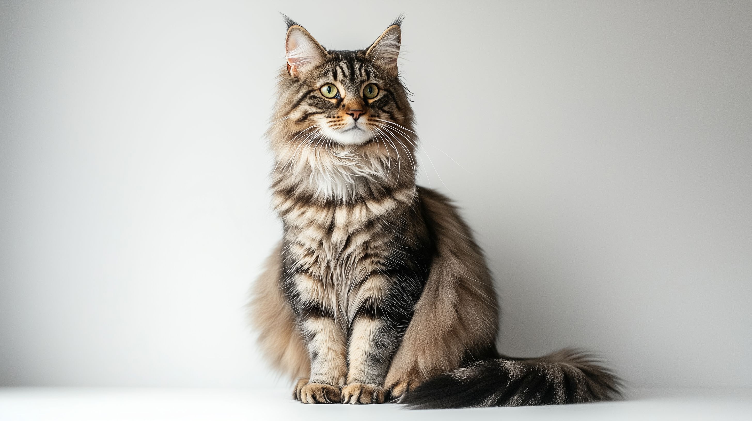Das Bild zeigt ein majestätisches Porträt einer Maine Coon Katze. Die Katze sitzt ruhig und selbstbewusst vor einem neutralen, hellen Hintergrund und blickt direkt in die Kamera. Ihr dichtes, mehrfarbiges Fell mit eleganten Streifen verleiht ihr eine besondere Ausstrahlung. Die Nahaufnahme lässt die feinen Details und die ausdrucksstarken Augen der Katze deutlich hervortreten. Dieses Stockfoto eignet sich hervorragend für den Einsatz in Blogbeiträgen, Newslettern, Social-Media-Kanälen oder Werbekampagnen rund um das Thema Haustiere, Katzen oder hochwertige Tieraufnahmen. Das Foto ist in hoher Auflösung verfügbar und steht unter einer kostenlosen Creative-Commons-Lizenz zur Verfügung.