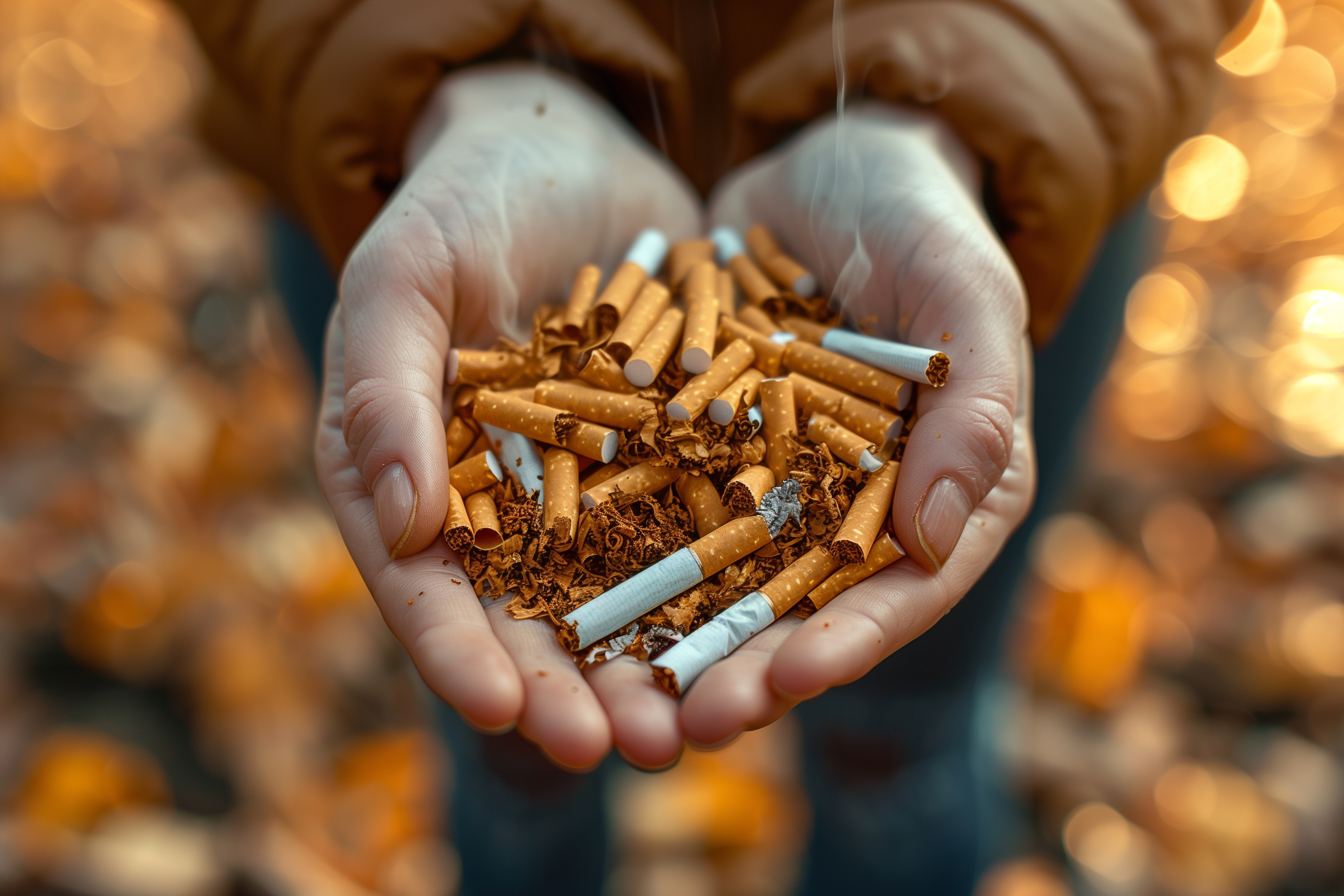 Das Bild zeigt eine Nahaufnahme von Händen, die mit Zigarettenkippen gefüllt sind. Die Zigaretten liegen in den hohlen Handflächen und bilden ein Herz-ähnliches Muster. Der Hintergrund ist unscharf, aber es ist erkennbar, dass er aus Bokeh-Lichtern besteht, die ein herbstliches oder weihnachtliches Ambiente schaffen. Das Bild vermittelt den Eindruck einer ungesunden und gefährlichen Angewohnheit sowie der Schwierigkeit, davon loszukommen. Es eignet sich für Beiträge in Blogs, Newslettern oder Social-Media-Kanälen zum Thema Raucherentwöhnung, Suchtprävention oder Gesundheit. Als kostenloses, hochauflösendes Stockfoto unter Creative-Commons-Lizenz ist es für eine Vielzahl von Anwendungen geeignet.