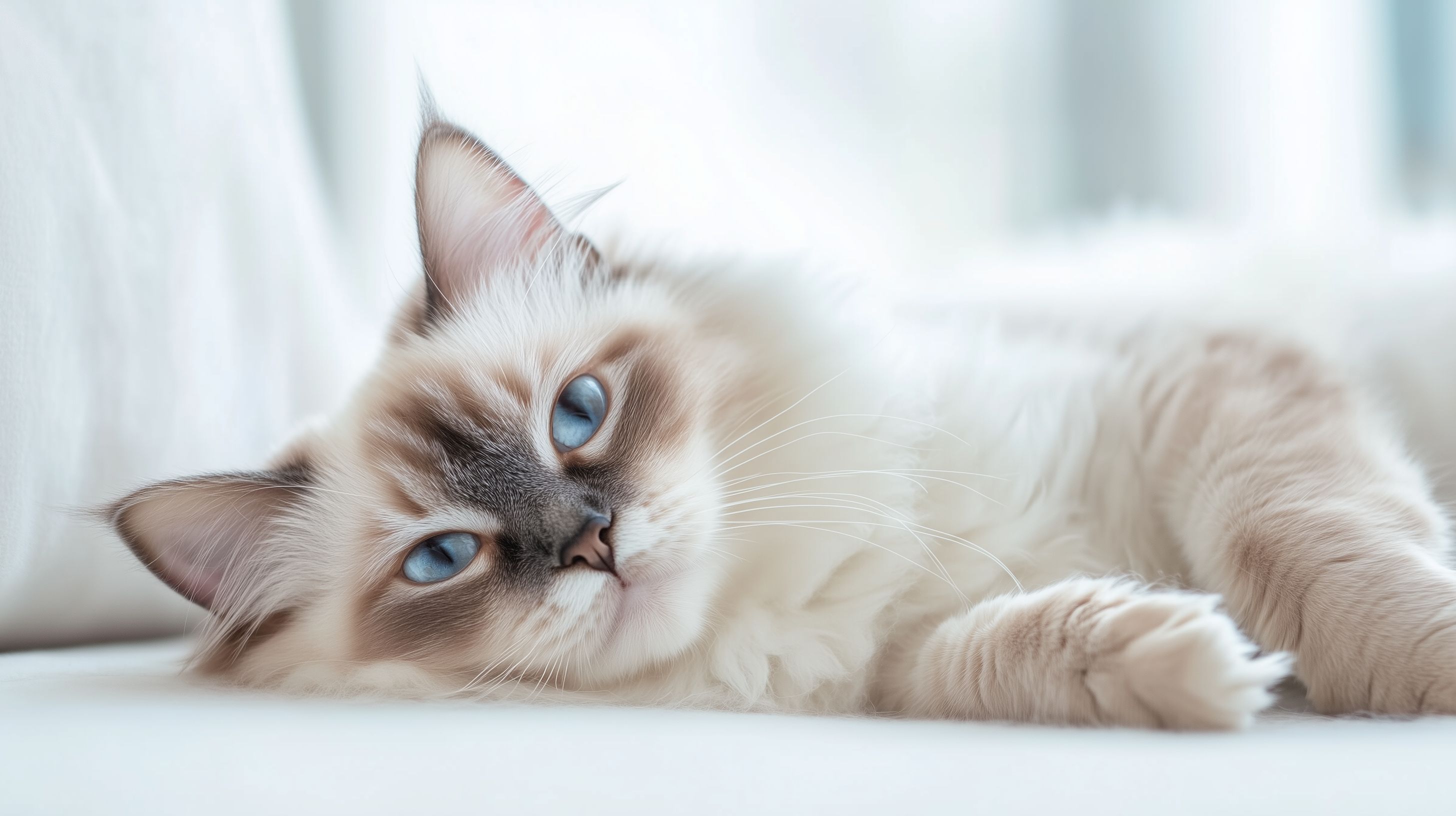 Dieses Foto zeigt eine friedlich liegende Ragdoll-Katze auf einem hellen Holzboden. Die Katze hat ein weiches Fell und tiefblaue Augen, die einen ruhigen und entspannten Ausdruck zeigen. Das Bild ist in einer Nahaufnahme aufgenommen und bietet einen klaren Blick auf das Gesicht und die Vorderpfoten des Tieres. Das schlichte Holzdesign des Bodens sowie der weiße Hintergrund schaffen eine schlichte und natürliche Atmosphäre, die das Bild für eine Vielzahl an Anwendungen, wie Blogs, Newsletter, Social Media-Beiträge oder Werbematerialien, nutzbar macht. Dieses hochauflösende und kostenlose Stockfoto unter Creative-Commons-Lizenz ist eine ideale Wahl für Ihre Projekte.