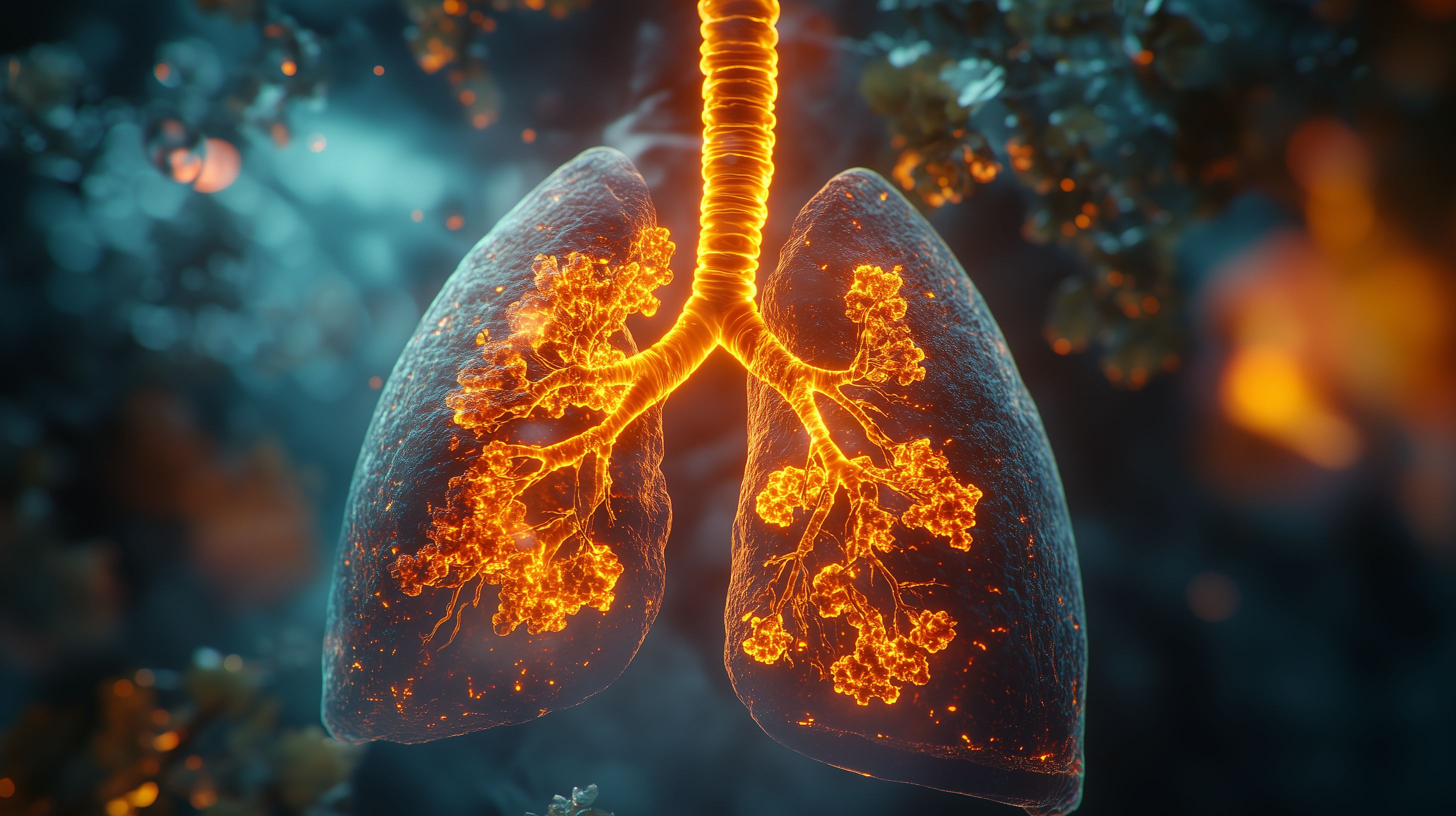 Dieses faszinierende Foto zeigt eine digitale Darstellung der menschlichen Lunge, die von Feuer und Glut durchzogen ist. Die Lungenstrukturen sind in leuchtenden Rottönen und kräftigen Orangenuancen abgebildet, was dem Bild eine energiegeladene und dynamische Ausstrahlung verleiht. Die Perspektive ist nah und detailliert, was den Fokus auf die Komplexität und Funktionalität dieses lebenswichtigen Organs lenkt.