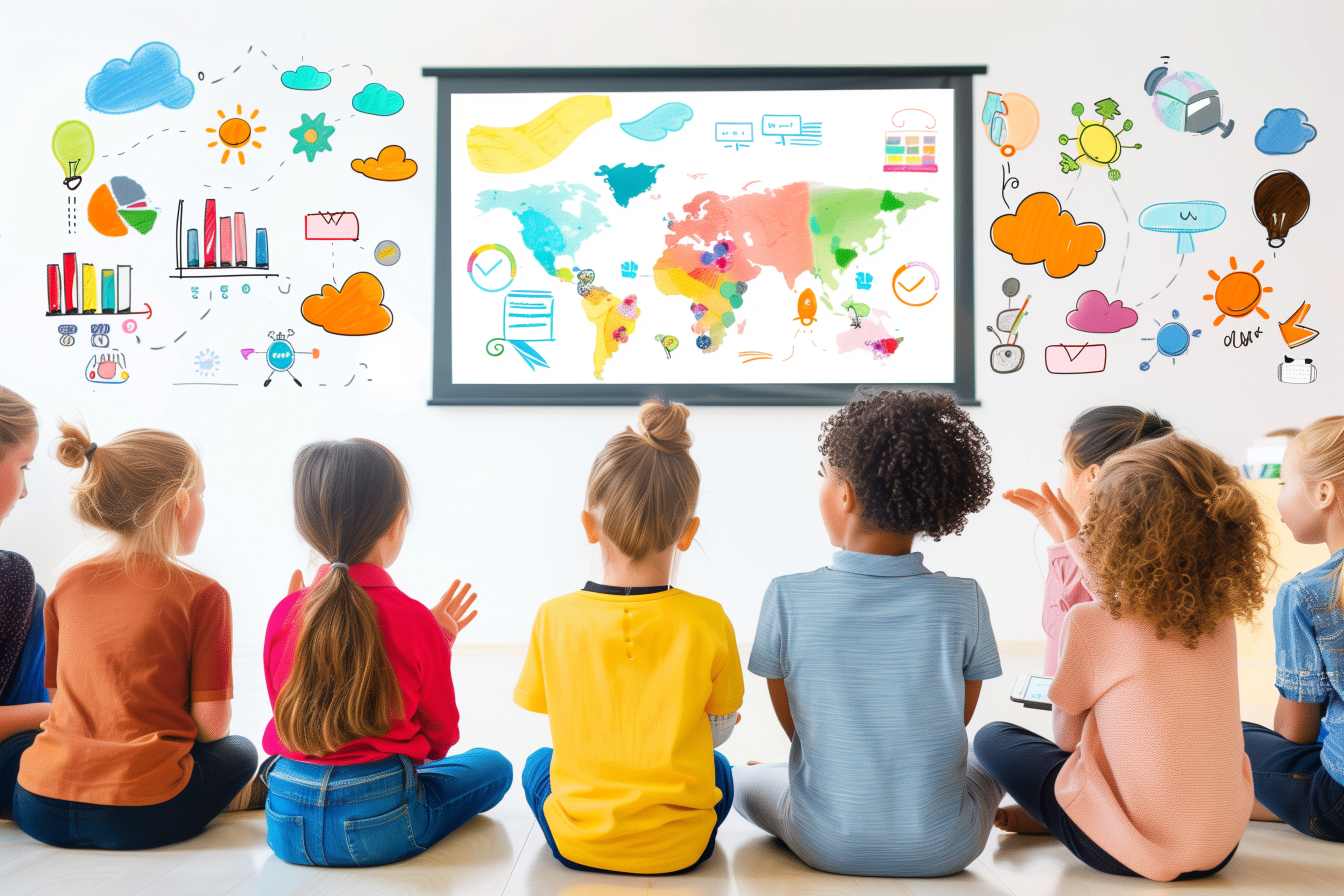 Die Kinder scheinen die Karte gemeinsam zu betrachten und zu erkunden, was darauf hinweist, dass es sich um eine Lernumgebung oder einen Unterrichtskontext handelt. Die Kinder tragen bunte, moderne Kleidung und sitzen aufmerksam vor der Leinwand.