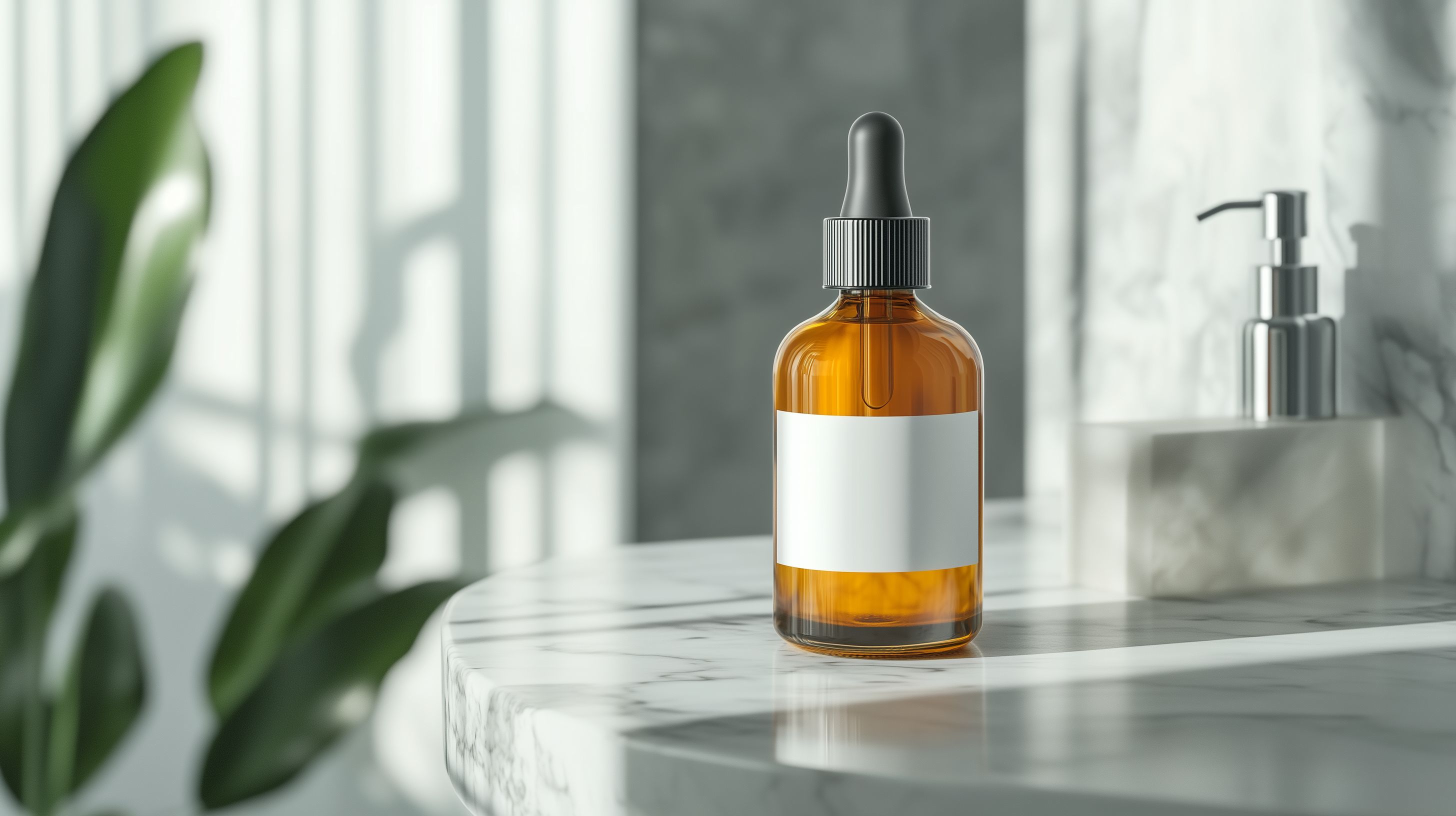 Das Bild zeigt eine Glasflasche mit einer Pipette-Verschlusskappe, die auf einem Marmortisch steht. Die Flasche enthält eine bernsteinfarbene Flüssigkeit, vermutlich ein Serum oder Öl für die Hautpflege. Im Hintergrund sind verschwommene Fenster und eine Zimmerpflanze zu sehen, was dem Bild einen natürlichen und minimalistischen Charakter verleiht. Diese hochauflösende Produktfotografie eignet sich ideal für den Einsatz als Stockfoto in Blogs, Newslettern, Social-Media-Beiträgen oder Werbematerialien zum Thema Naturkosmetik, Gesundheit und Wellness. Das Bild ist unter einer Creative-Commons-Lizenz verfügbar und kann daher kostenfrei genutzt werden.