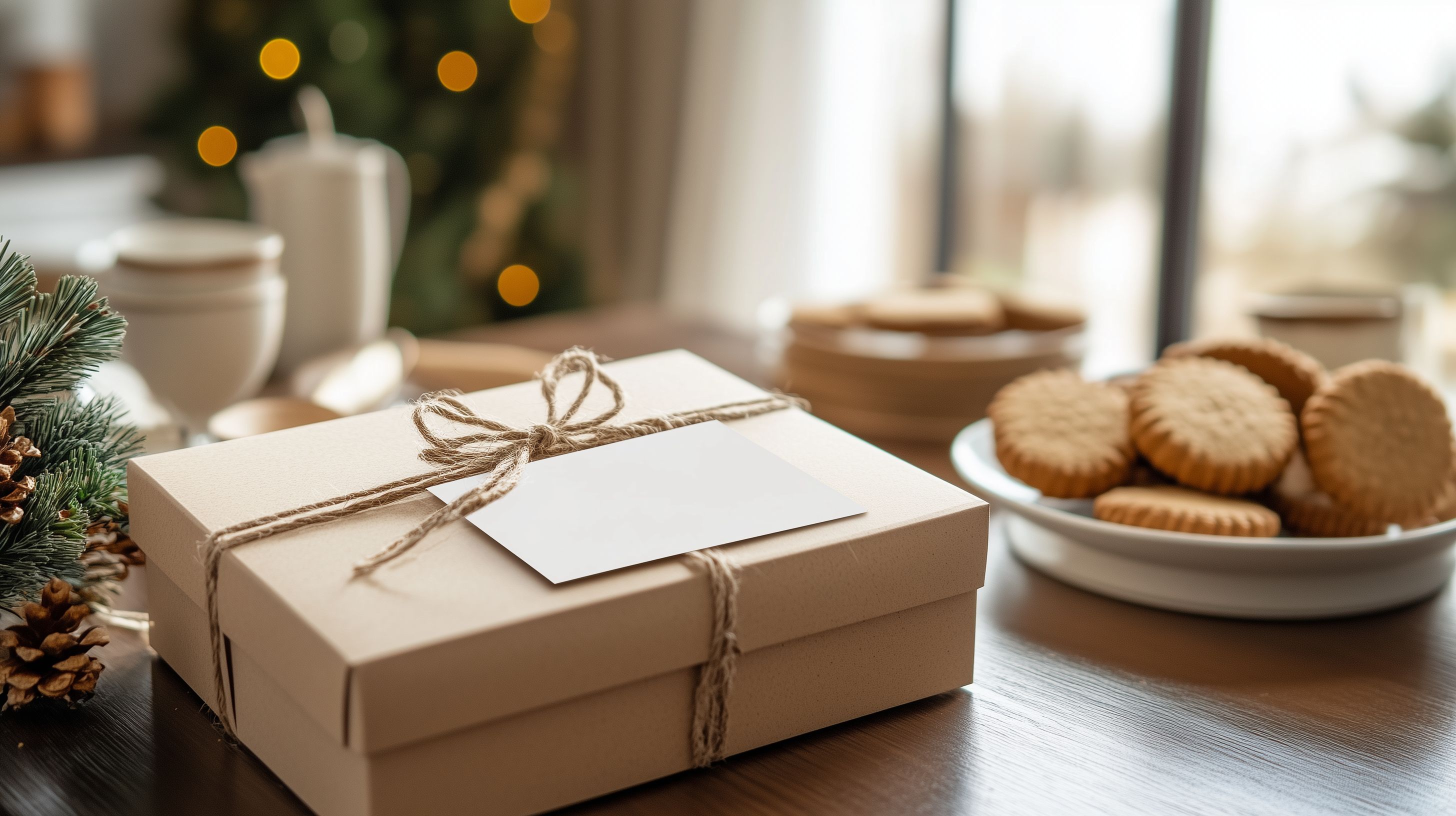 Das Foto zeigt einen festlich gedeckten Esstisch mit einer Geschenkbox, Keksen und anderen weihnachtlichen Dekorationen. Der Hintergrund ist warm und stimmungsvoll beleuchtet mit Lichterketten, was eine gemütliche Atmosphäre schafft. Die Geschenkverpackung ist in Naturmaterialien gehalten und mit Naturmotiven verziert, was den rustikalen und traditionellen Charakter des Arrangements unterstreicht. Insgesamt vermittelt das Bild eine heimelige Stimmung und lässt den Betrachter in Vorfreude auf die Weihnachtszeit verfallen. Dieses kostenlose Stockfoto in hoher Auflösung eignet sich hervorragend für Weihnachtsdekorationen, Werbung oder festliche Blogbeiträge unter einer Creative Commons-Lizenz.