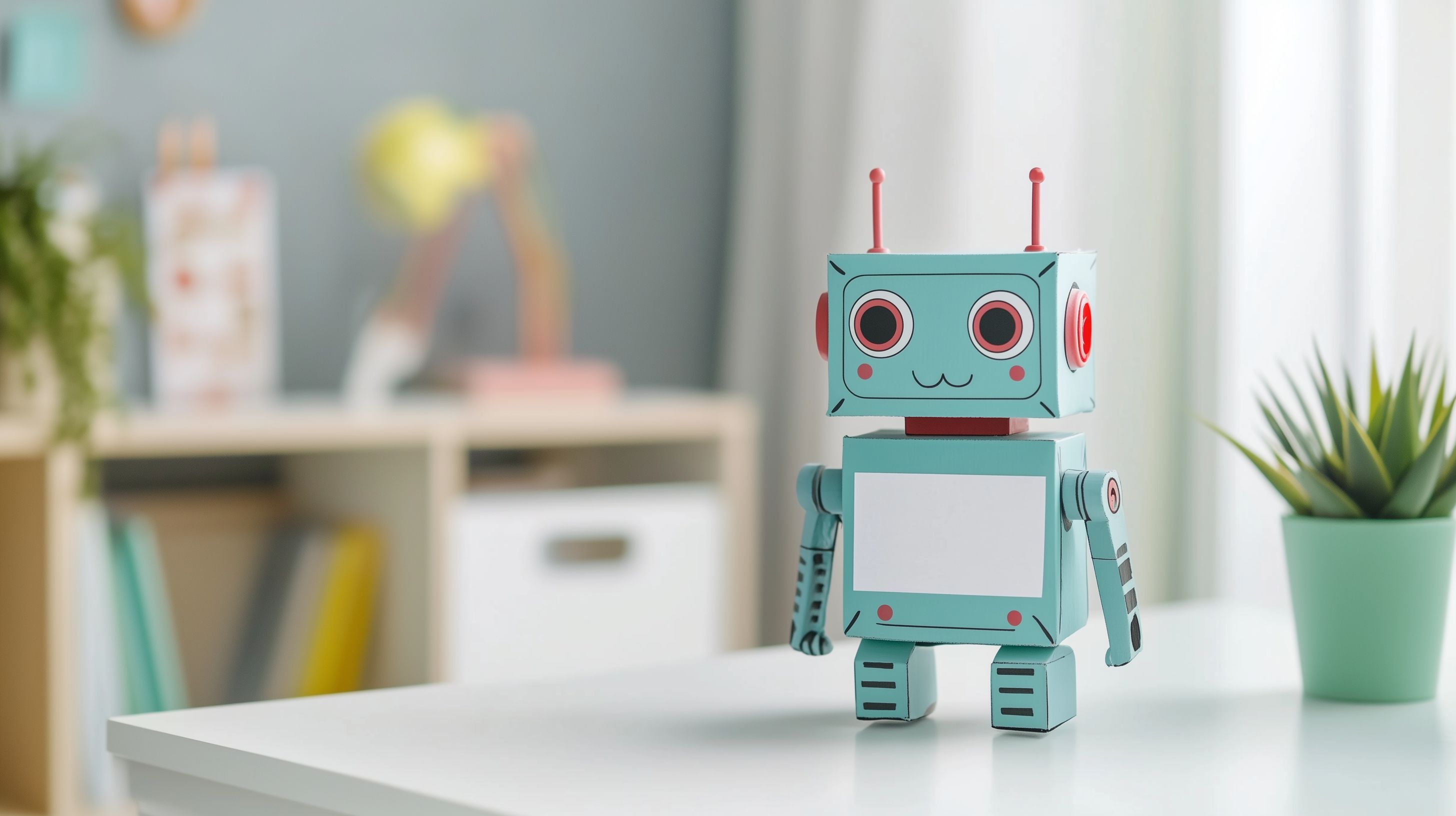 Das Bild zeigt einen niedlichen, pastellfarbenen Roboter auf einem weißen Schreibtisch in einer modernen, hellen Büroumgebung. Der Roboter hat große, freundliche Augen und eine strahlendfarbige Oberfläche, die ihn sehr kindlich und verspielt erscheinen lässt. Im Hintergrund sind Regale, Pflanzen und weitere Accessoires zu sehen, die eine entspannte, natürliche Atmosphäre in einem Kinderzimmer oder einem kreativen Büroraum vermitteln.