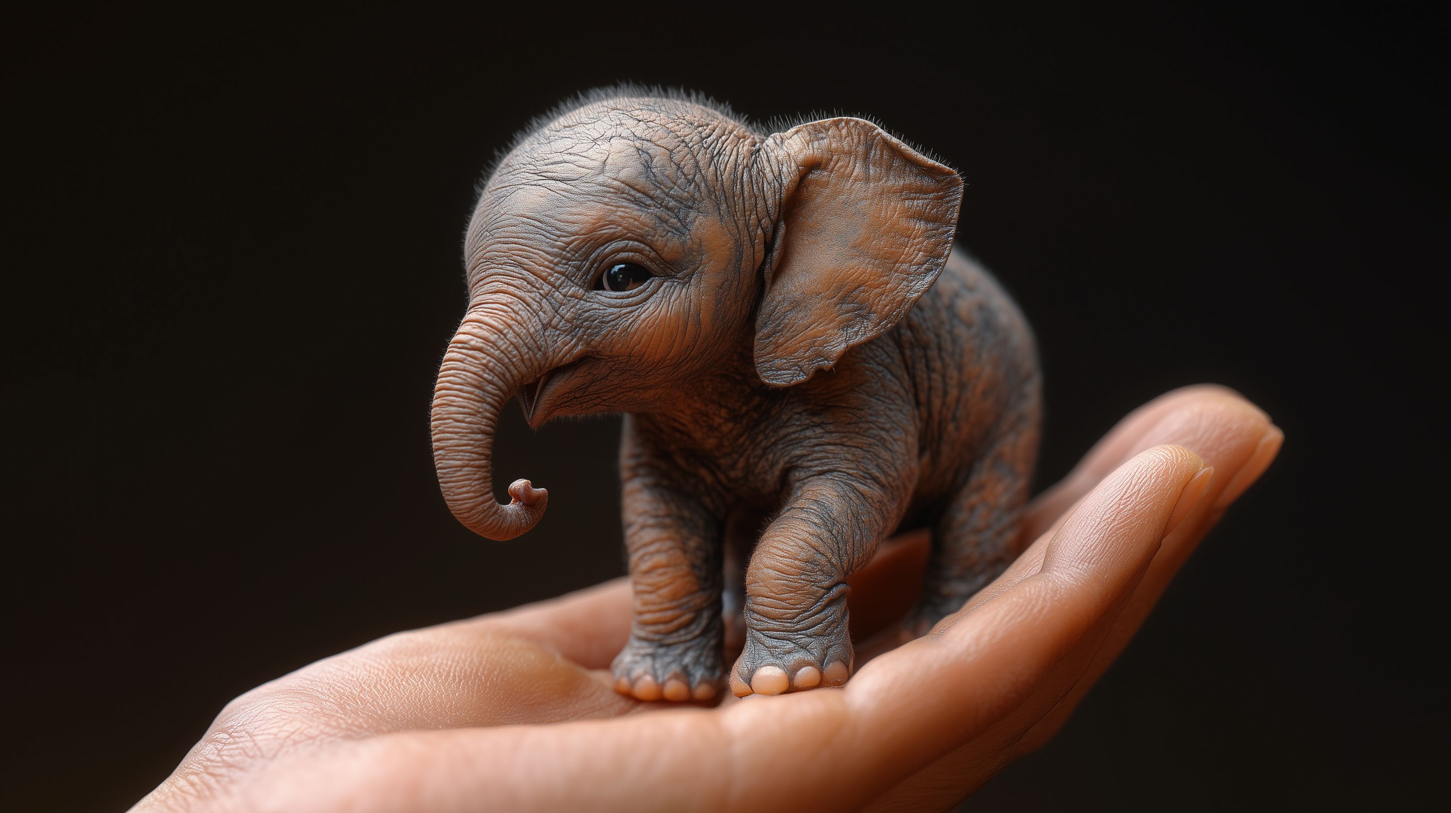 Dieses faszinierende Foto zeigt das zarte Elefantenbaby auf der Handfläche eines Menschen. Die detailreiche Nahaufnahme lässt die Feinheiten der Elefantenhaut und die winzigen Bewegungen des Babys deutlich erkennen. Die warmen Brauntöne des Tieres kontrastieren wunderschön mit dem dunklen Hintergrund, der den Fokus ganz auf das Motiv lenkt. Dieses einzigartige Stockfoto eignet sich hervorragend für den Einsatz in Blogs, Newslettern, Werbematerialien oder Social-Media-Kanälen. In hoher Auflösung und unter Creative-Commons-Lizenz frei verfügbar, bietet es eine ganz besondere Perspektive auf das Wunder des Lebens.