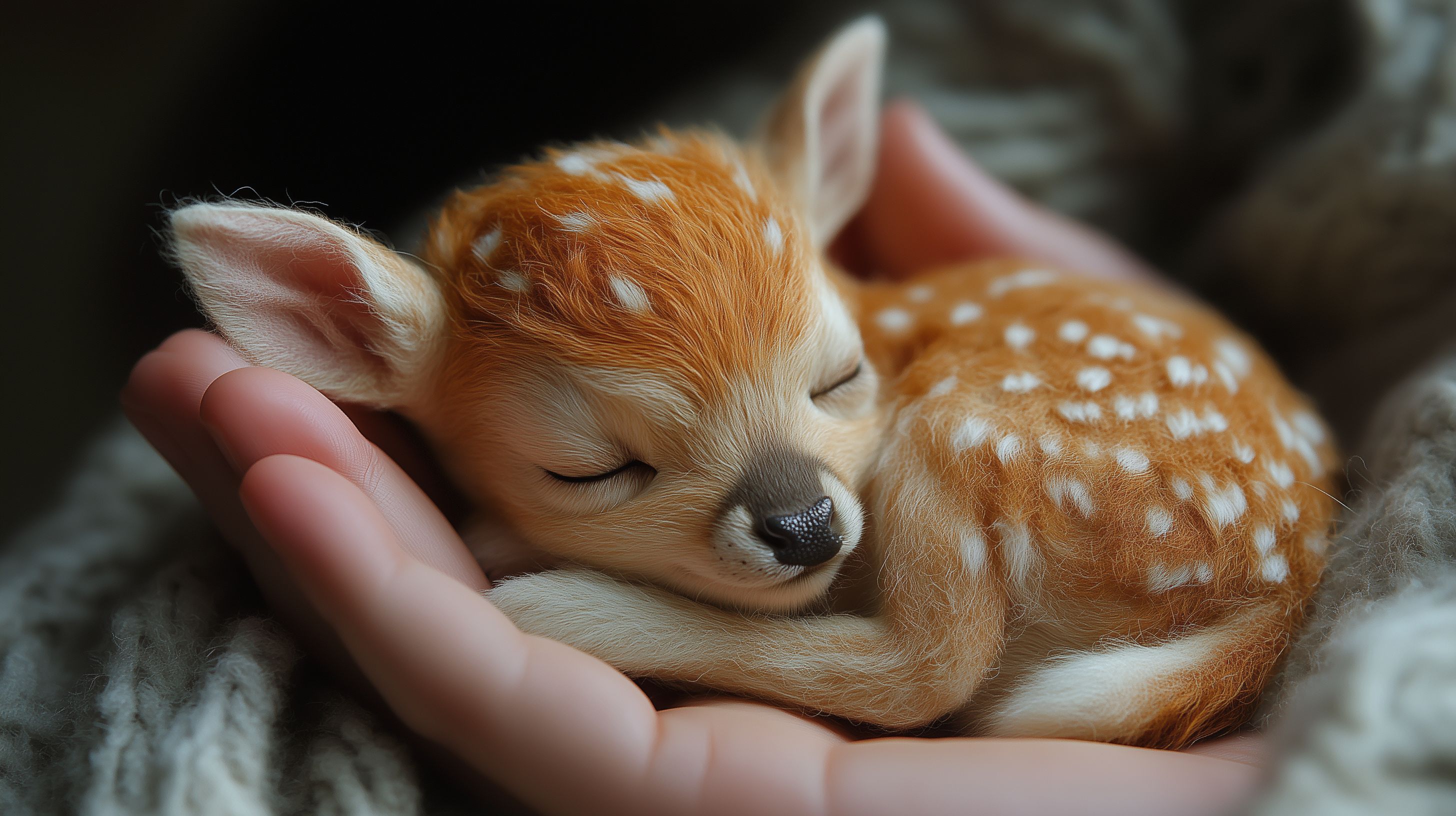 Das Bild zeigt ein friedlich schlafendes Rehkitz, eingebettet in einer menschlichen Hand. Das winzige, karamellfarbene Tierbaby liegt mit geschlossenen Augen, umgeben von einem Fell-Muster, das an einen Hirsch erinnert. Die Szene vermittelt Ruhe, Fürsorge und den Schutz der Natur. Dieses kostenlose Stockfoto in hoher Auflösung eignet sich ideal für Blogbeiträge, Newsletter, Social-Media-Posts oder Werbematerialien zum Thema Tierschutz, Naturschutz und die Schönheit der Tierwelt. Es steht unter der Creative-Commons-Lizenz zur freien Nutzung zur Verfügung.