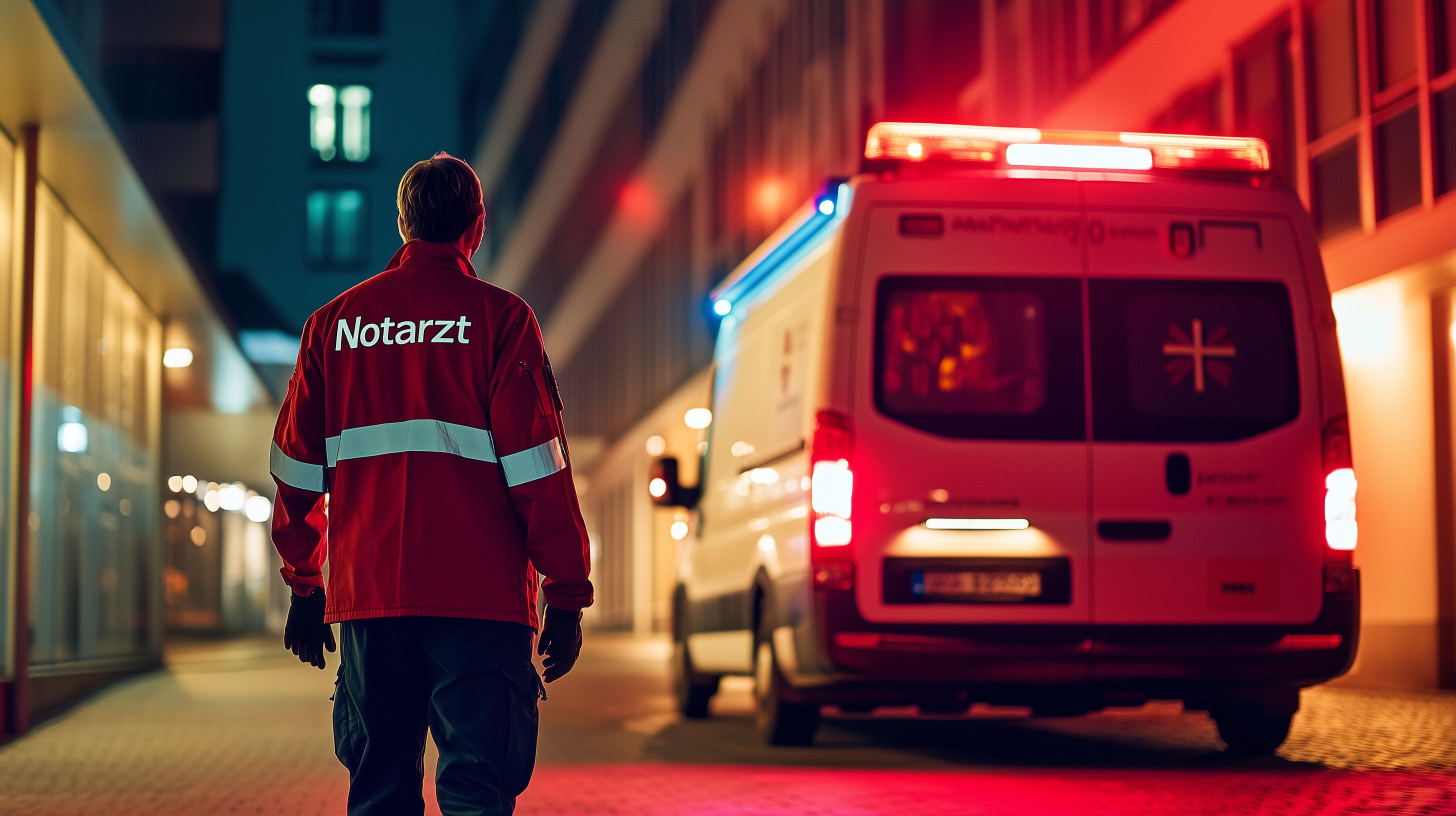 Das Bild zeigt einen Notarzt in roter Uniform, der nachts auf dem Weg zu einem Einsatz ist. Im Hintergrund ist ein Rettungswagen mit eingeschaltetem Blaulicht zu sehen, der auf der dunklen Straße steht. Die Beleuchtung und die roten Akzente des Bildes erzeugen eine dramatische und dringliche Stimmung, die den Einsatz des Notarztes unterstreicht. Dieses hochauflösende Stockfoto eignet sich hervorragend für Verwendungen in Artikeln, Newslettern oder sozialen Medien rund um Themen wie Gesundheit, Rettungsdienst oder Notfallversorgung. Es steht unter einer Creative-Commons-Lizenz zur freien Nutzung zur Verfügung.