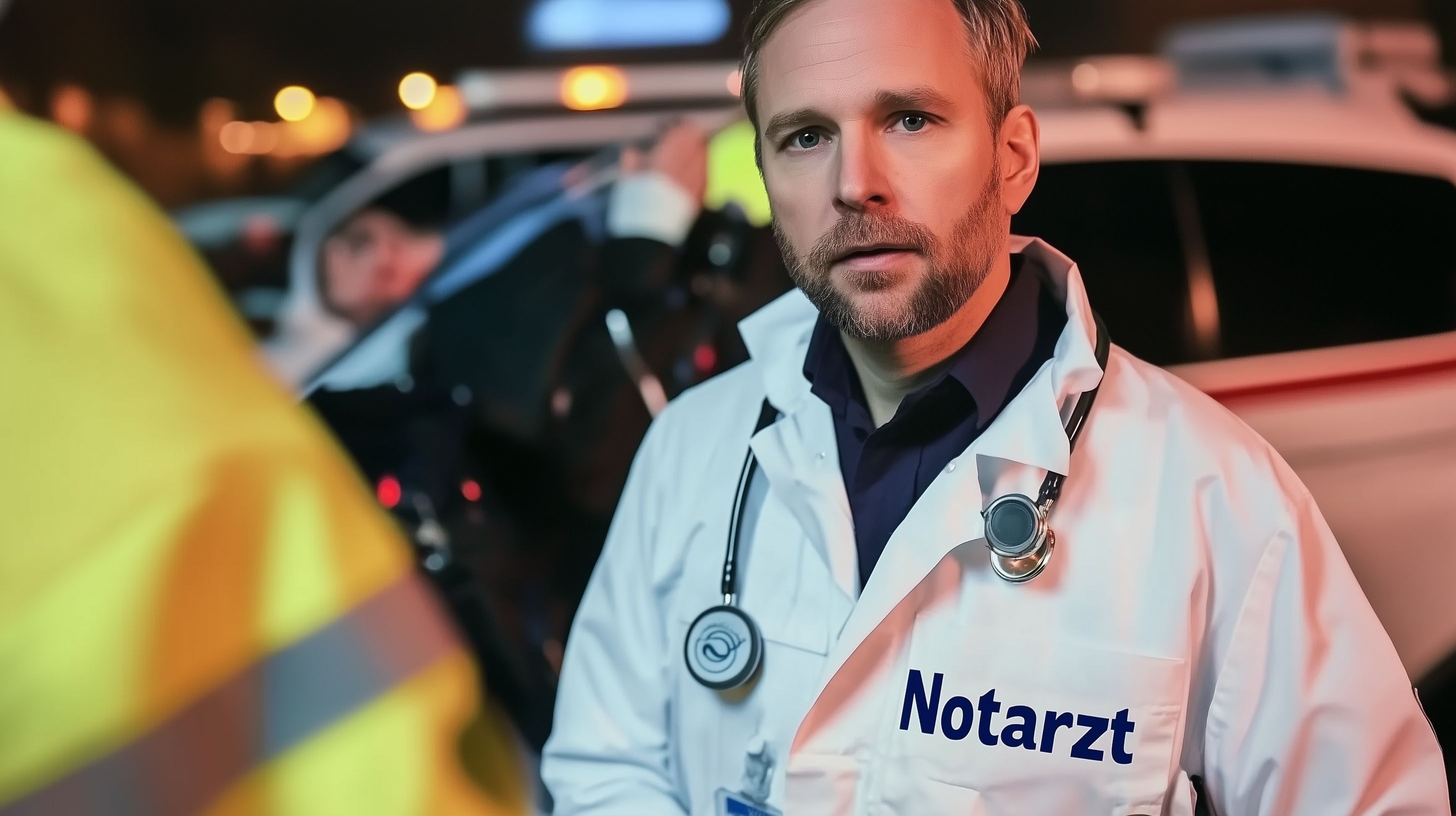 Das Foto zeigt einen Rettungssanitäter in seinem weißen Einsatzmantel, der bei Nacht an einem Unfallort steht. Der Sanitäter blickt ernst in die Kamera, während im Hintergrund die Lichter eines Rettungsfahrzeugs zu sehen sind. Das Bild vermittelt die Dringlichkeit und den Ernst einer Notfallsituation, in der der Sanitäter professionell und umsichtig eingreift, um schnell und kompetent Hilfe zu leisten.