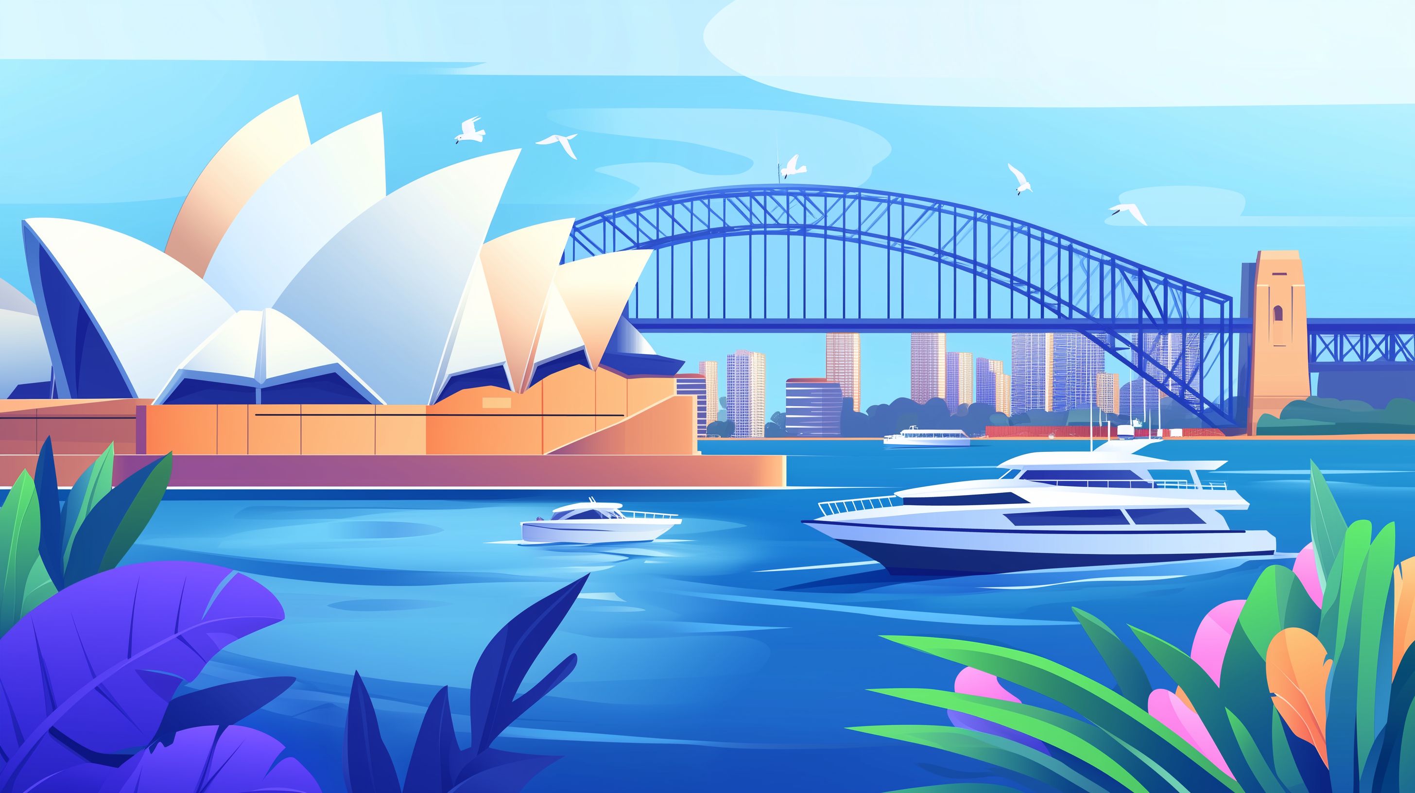 Dieses Vektorbild zeigt eine detaillierte Illustration der Skyline von Sydney, Australien. Im Vordergrund sind der markante Sydney Opera House sowie die berühmte Sydney Harbour Bridge zu sehen. Umgeben sind die Wahrzeichen von Kreuzfahrtschiffen, Booten und einer idyllischen Uferpromenade. Die Illustration zeichnet sich durch ihre lebendigen Farben, scharfe Linien und realistische Perspektive aus. Dieses hochwertige Stockfoto in hoher Auflösung eignet sich hervorragend für den Einsatz in Blogs, Werbekampagnen, Social-Media-Kanälen oder Präsentationen zum Thema Reisen, Tourismus und Australien. Das Bild steht unter einer Creative-Commons-Lizenz zur kostenlosen Nutzung zur Verfügung.
