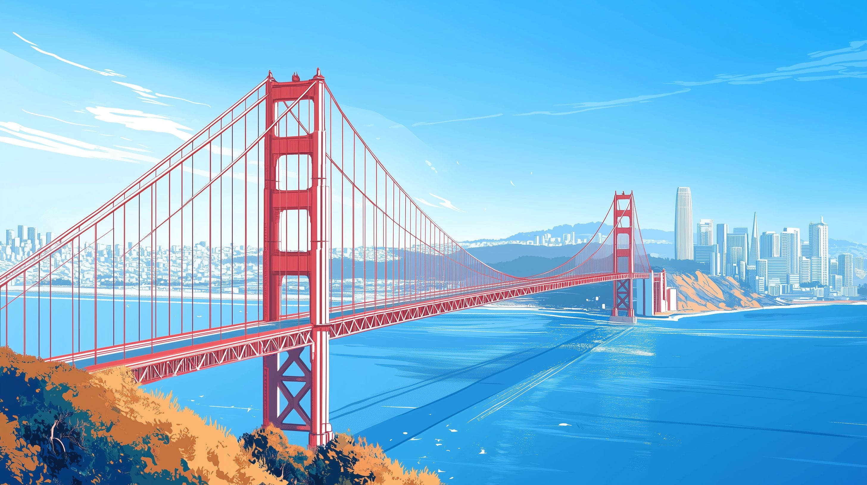 Dieses atemberaubende Foto zeigt die ikonische Golden Gate Bridge in San Francisco vor einem strahlend blauen Himmel. Die rote Brückenkonstruktion erstreckt sich über die Meerenge und verbindet das Stadtgebiet mit den Hügeln am gegenüberliegenden Ufer. Im Vordergrund ist das glitzernde Wasser des Pazifischen Ozeans zu sehen, während im Hintergrund die Skyline von San Francisco mit modernen Wolkenkratzern zu erkennen ist. Die Perspektive bietet einen beeindruckenden Panoramablick auf dieses weltbekannte Wahrzeichen Kaliforniens. Dieses hochauflösende, kostenlose Stockfoto eignet sich perfekt für Blogbeiträge, Newsletter, Social-Media-Posts oder Werbematerialien rund um Reisen, Tourismus und Architektur.