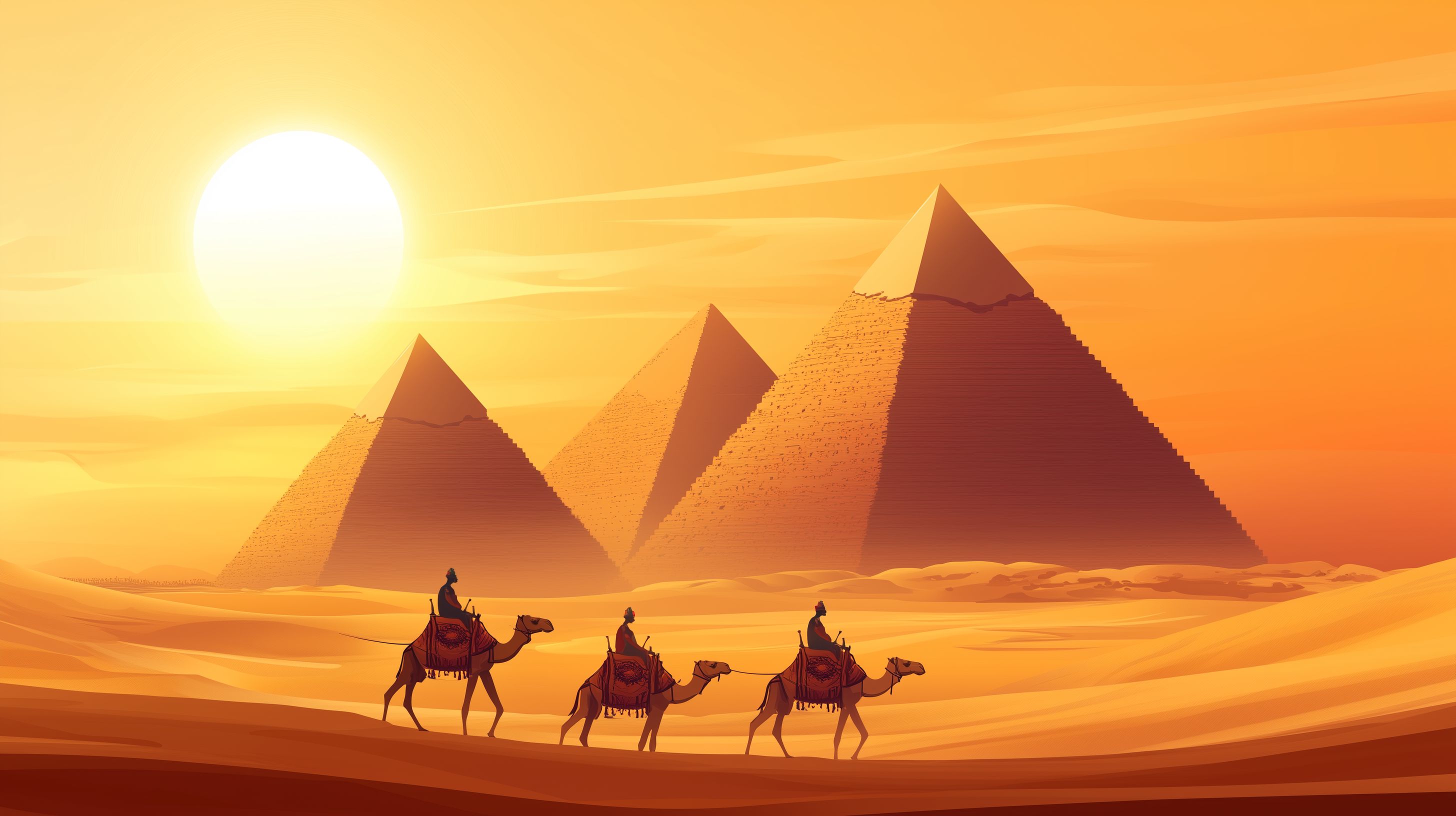 Das Bild zeigt eine wunderschöne Wüstenlandschaft mit den ikonischen Pyramiden von Gizeh bei Sonnenuntergang. Im Vordergrund reiten drei Kameltreiber über den Sandweg, während im Hintergrund die majestätischen Pyramiden vor dem orangeroten Himmel thronen. Die Szene strahlt eine mystische, orientalische Atmosphäre aus und lädt dazu ein, sich in eine vergangene Zeit zu versetzen. Dieses Motiv eignet sich hervorragend als kostenloses Stockfoto für Websites, Blogs, Social-Media-Posts und Werbematerialien rund um Themen wie Reisen, Abenteuer, Geschichte und Tourismus. Die hochauflösende Datei steht unter der Creative-Commons-Lizenz zur freien Nutzung zur Verfügung.