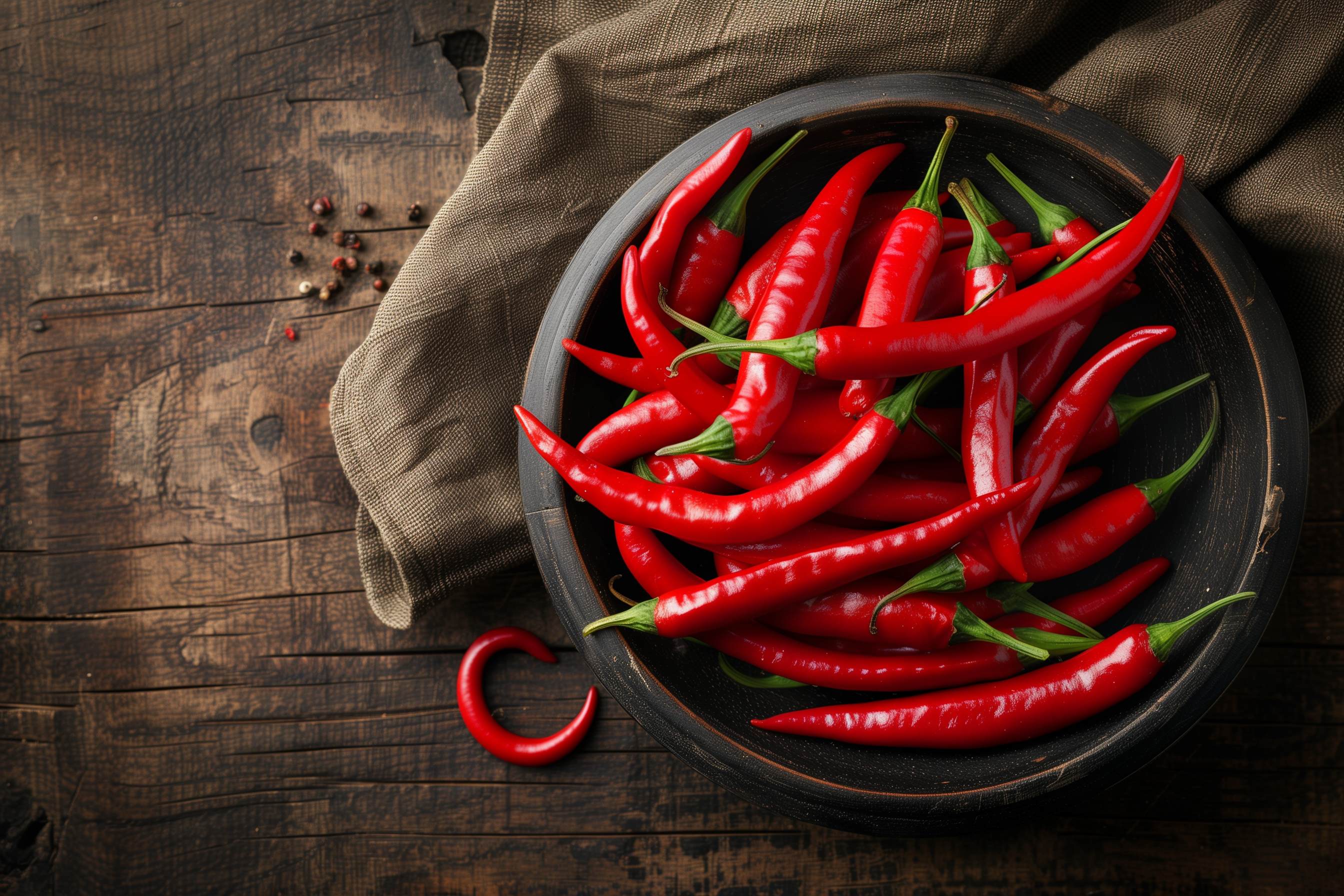 Dieses Foto zeigt eine Nahaufnahme von roten Chilischoten, die in einer schwarzen Schüssel auf einem rustikalen Holzuntergrund platziert sind. Die frischen und knackigen Chilischoten heben sich kontrastreich von dem dunklen Holzton ab und verleihen der Szene eine lebendige und appetitliche Ausstrahlung. Die Chilischoten können als natürliche, gesunde Zutat für die Küche eingesetzt werden, etwa zum Würzen von Speisen oder für den Einsatz in Salaten oder Smoothies. Das Foto ist ideal als kostenloses Stockfoto in hoher Auflösung für Blogs, Newsletter, Social-Media-Beiträge oder Werbematerialien geeignet und steht unter einer Creative-Commons-Lizenz zur Verfügung.